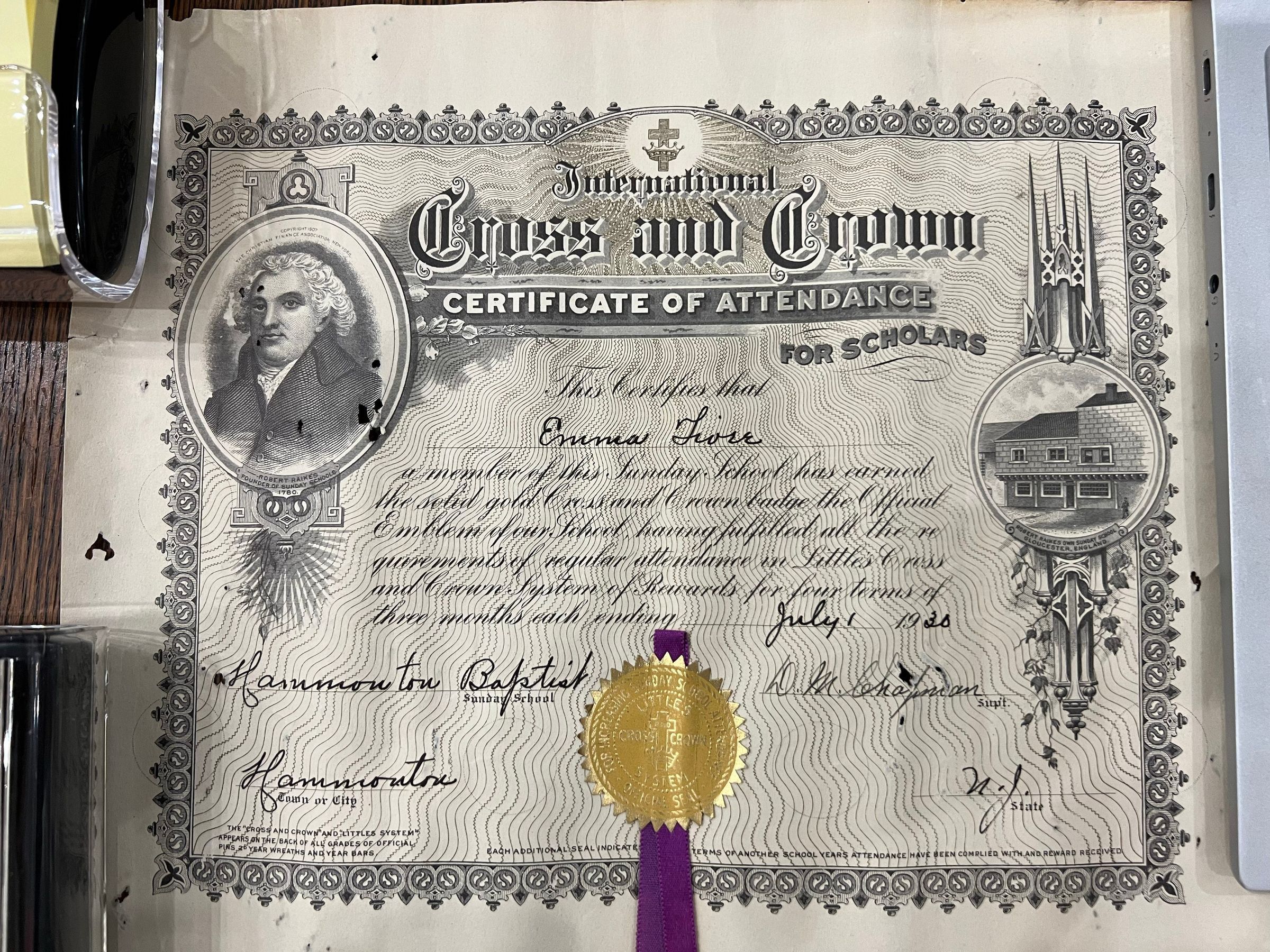 1930 International Cross and Crown Certificate of Attendance presented by the Methodist Church to Emma Fiore on July 1, 1930Acquisition