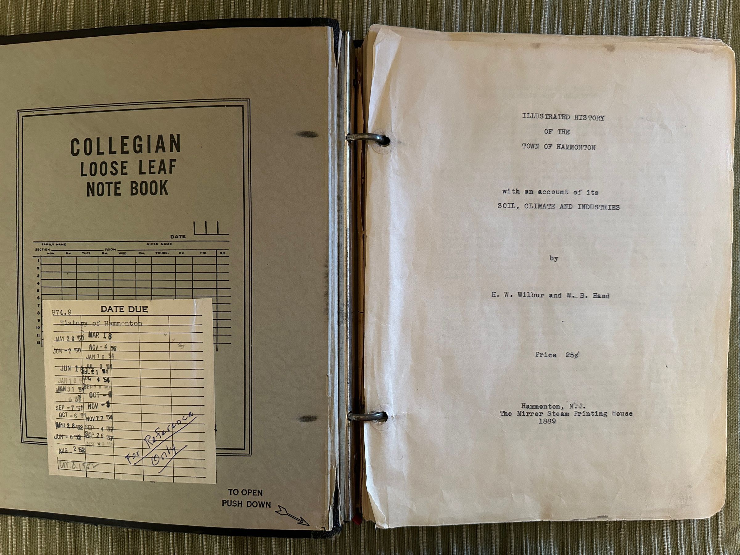 Hand typed manuscript of the “ Illustrated History Of The Town Of Hammonton”. Authors: H.W. Wilbur and W. B. Hand, Published by the Mirror Stream Printing House, Hammonton N.J., 1889, Price 25 cents. Copy owned by At.Co. Library. The book was later republished by the Historical Society of Hammonton. In black leather binder- 9”x 11”. Fair condition. Pages yellowed, stained, notes written in margins.
