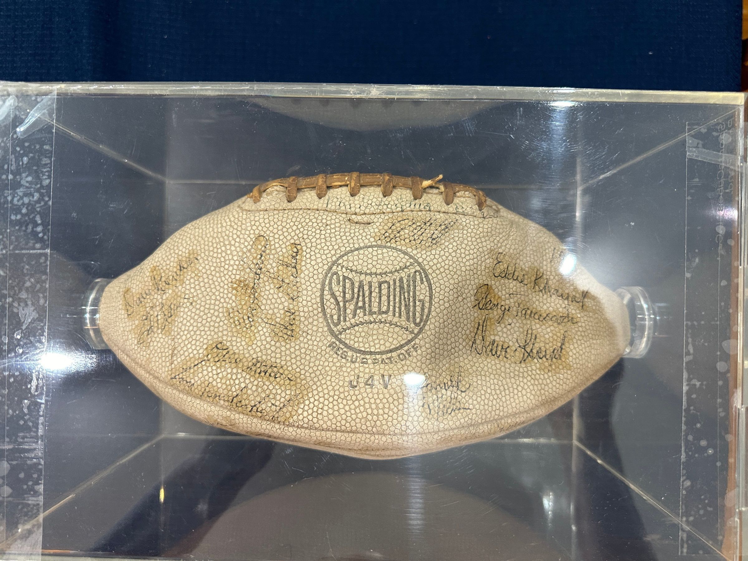 HHS Football in Case - several dates including 1947 and others along with many signatures from athletes on ball