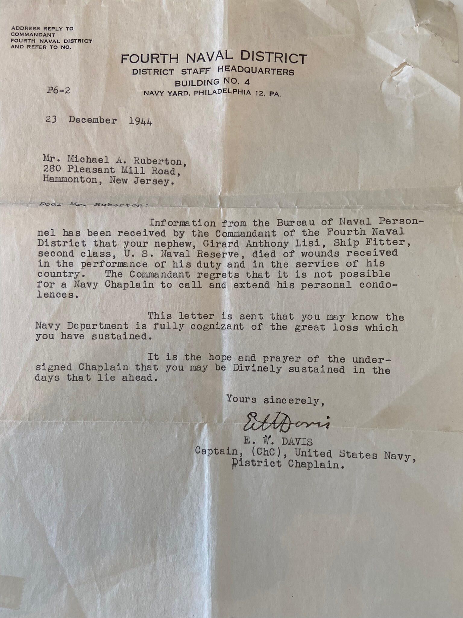 Letter from Fourth Naval District- Dated 12/23/44Acquisition