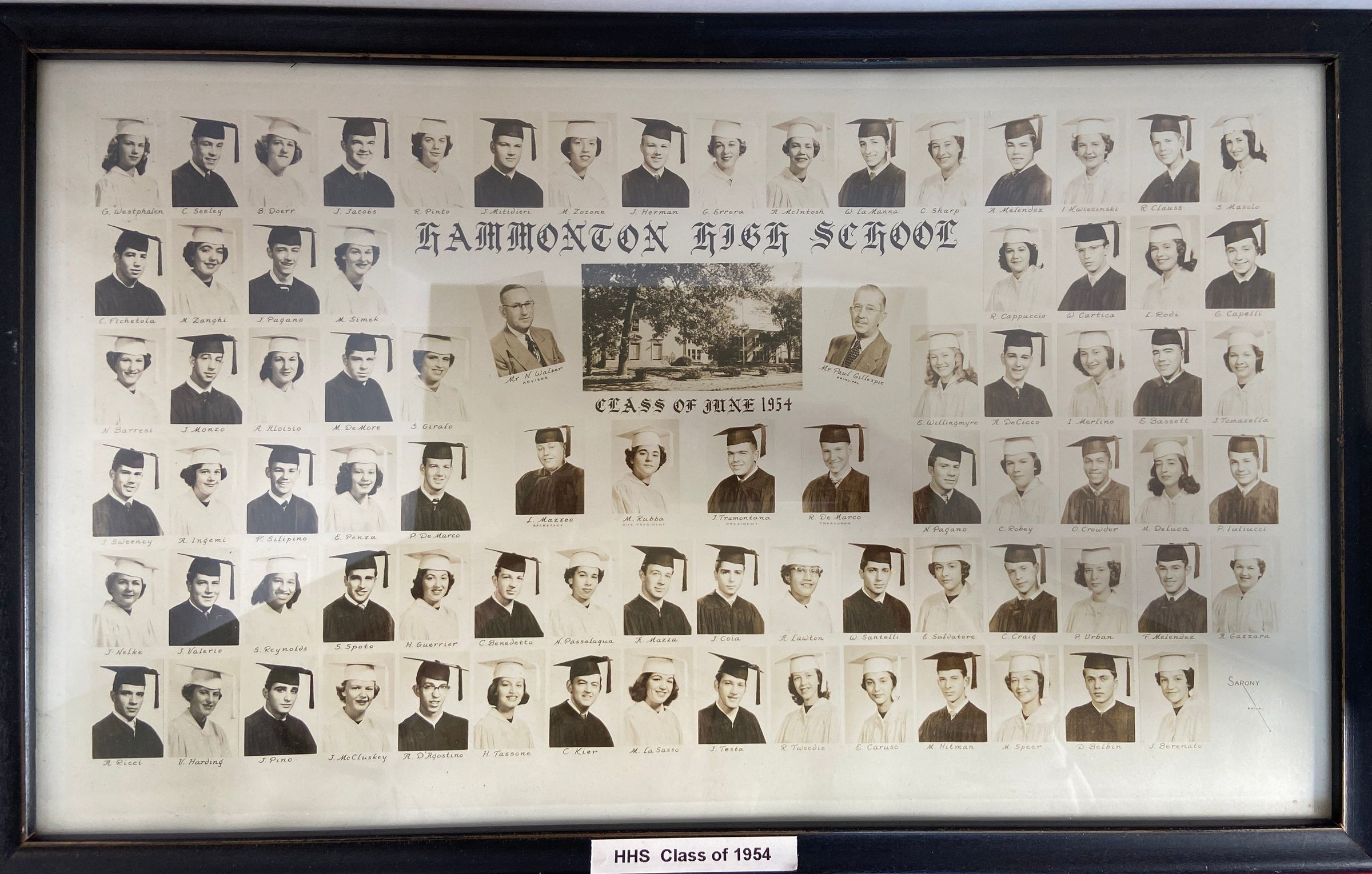 Framed black and white photograph of the 1954 Graduating Class of Hammonton High School