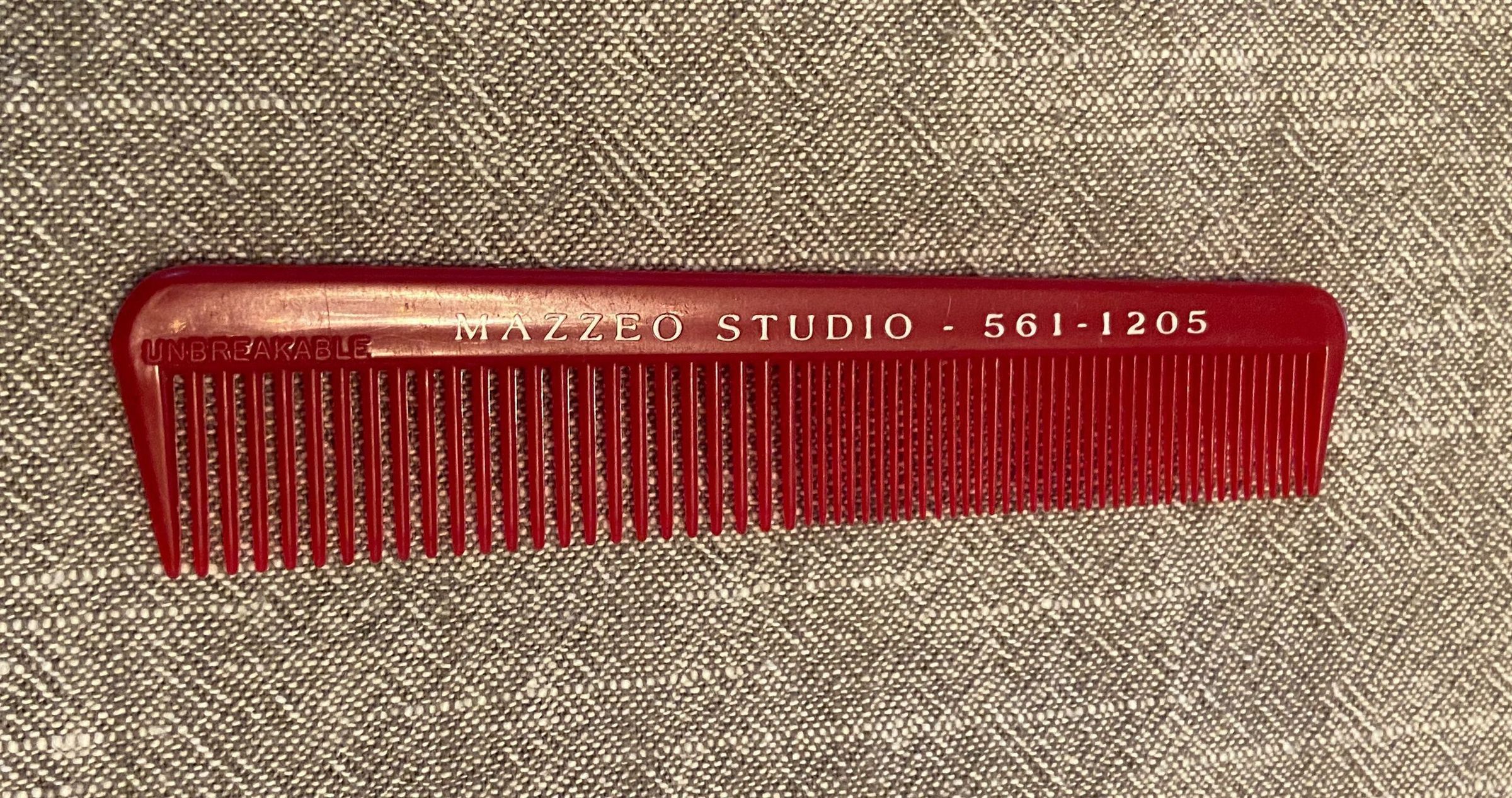 Comb- Advertising piece for Mazzeo Studio. Red plastic comb approximately 5” long. Printed on the comb in gold lettering is “Mazzeo Studio - 561-1205”