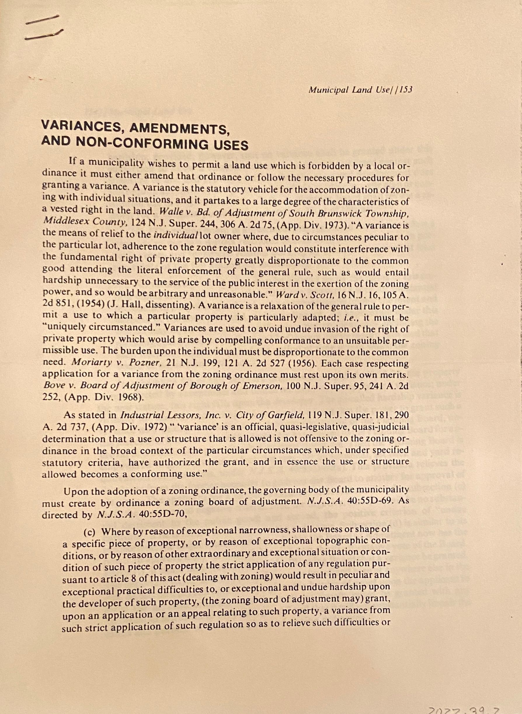 Stapled photocopy of the article, “Variances, Amendments, and Non-Conforming Uses” from Municipal Land Use, pps.153-176, date unknown, but with 1979 as the date of the latest referenced case identified in the article- see the third paragraph of Pg 175 and the third paragraph of pg 176.