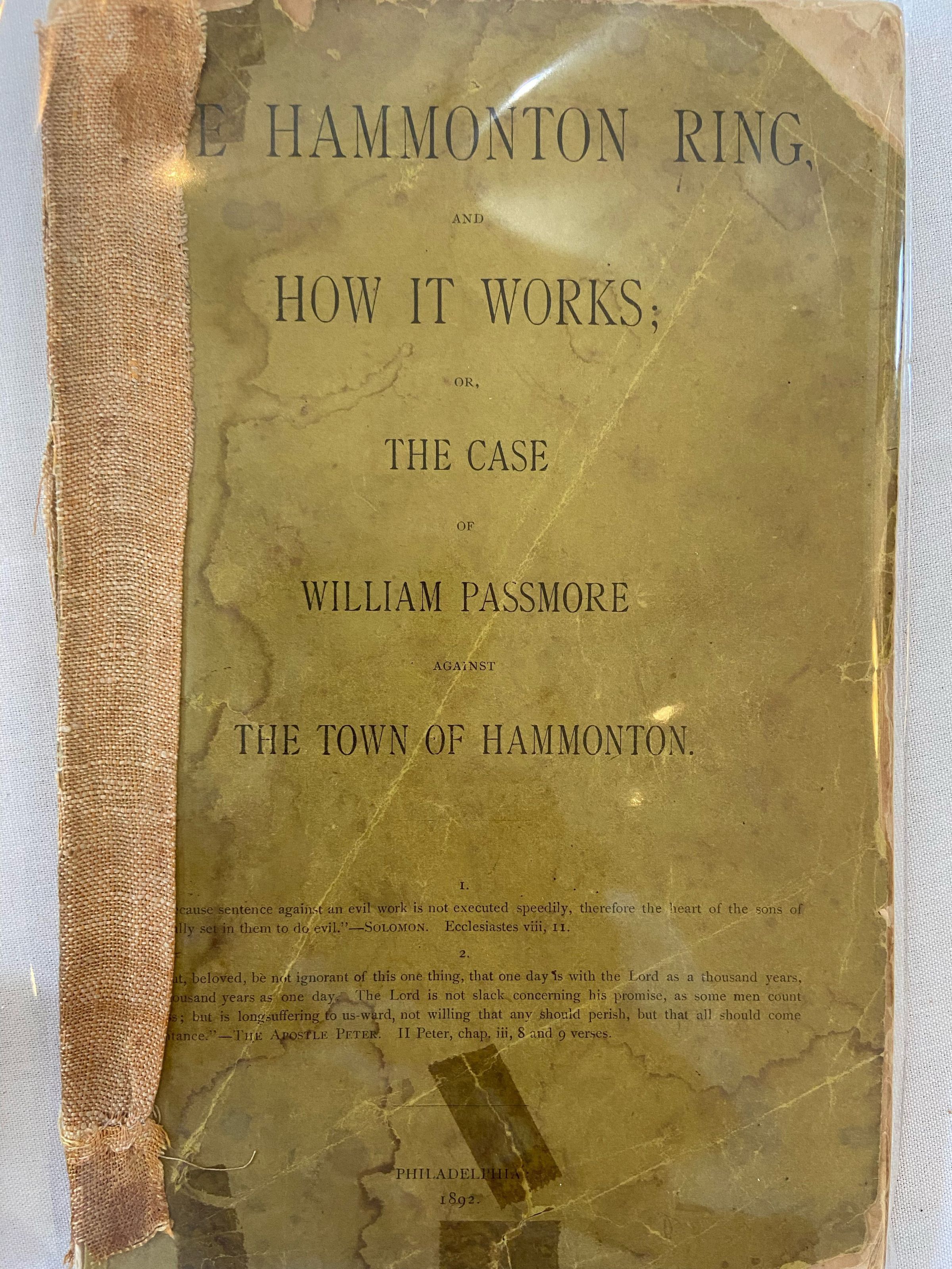 The Case of William Passmore against The Town of Hammonton, William Passmore, Author, Original copy- self published 1891, Philadelphia