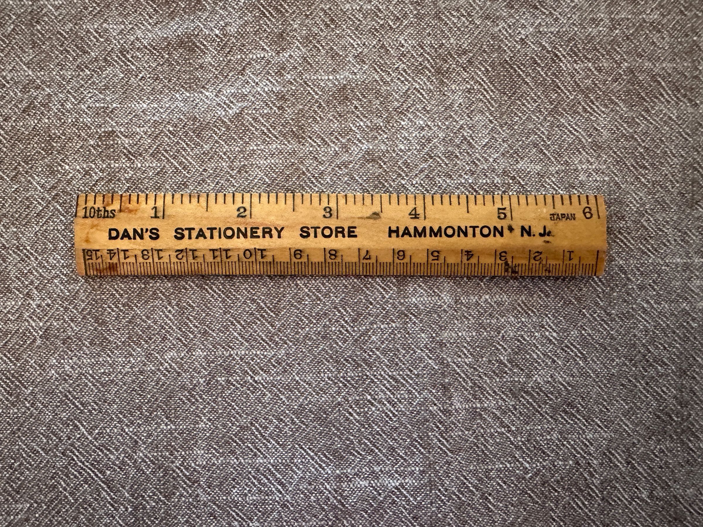 6” Wooden Ruler with Dan’s Stationary Store, Hammonton, N.J. written in black. Ruler measures in inches (1/10,1/16, 1/8” intervals) and centimeters, 6+”.Acquisition