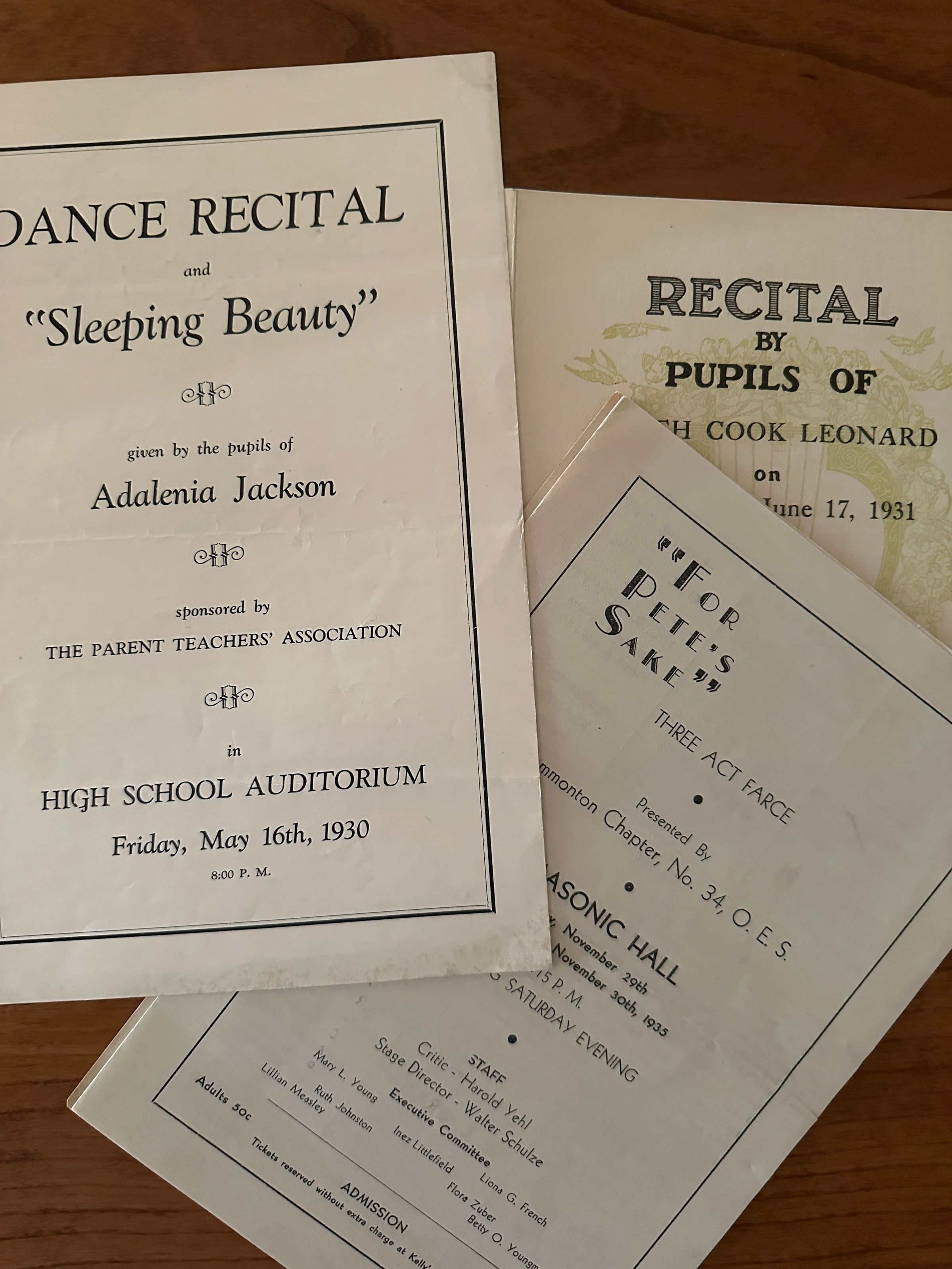 1111.110.5- Collection of Plays and Entertainment performed in Hammonton between 1930- 1939 1111.110.5.1- 1930, Sleeping Beauty, performed by the Students of Adelenia Jackson, booklet, Hammonton High School Auditorium, Parent Teachers' Association 1111.110.5.2- 1931, Dance Recital and Ali Baba An The Thieves, performed by the pupils of Adalenia Jackson, flyer, Hammonton High School Auditorium 1111.110.5.3- 1931, Recital by Pupils of Edith Clark Leonard, performed by the Pupils of Edith Clark Leonard, booklet, Theo Pressor Co 1111.110.5.4- 1932, A Night In New York, performed by the pupils of Adalenia Jackson, Hammonton High School Auditorium 1111.110.5.5- 1932, Sacrificial Gardens, performed by the Delphian Society, handmade booklet 1111.110.5.6- 1933, Aren't We All!, flyer, Hammonton High School Auditorium, presented by The American Legion Post 186, Veterans of Foreign Wars, Post 1026 1111.110.5.7- 1933, Musicale, flyer, Hammonton High School Auditorium, Hammonton High School Alumni Association 1111.110.5.8- 1933, Dancing Day Dreams, performed by the Adalenia Jackson pupils, booklet, High School Auditorium, Hammonton Branch of the Atlantic County Library 1111.110.5.9- 1933, Rainbow of the Rio Grande, performed by the Frederick B. Ingram Production, booklet, Hammonton High School Auditorium 1111.110.5.10- 1934, Musicale and Reception to Benefit Hammonton Junior Red Cross, flyer, Hammonton High School Alumni Association 1111.110.5.11- 1935, For Pete's Sake-Three Act Farce booklet, Masonic Hall, Masonic Hall Hammonton Chapter No 34 1111.110.6.12- 1936, Stardust & Stars, performed by the Adalenia Jackson Dancers, booklet, Hammonton High School Auditorium, presented by the Adalenia Jackson Dancers 1111.110.5.13- 1938, Carry On', performed by the I.L.G.W.U. Social Club Hammonton, booklet, Hammonton High School Auditorium, I.L.G.W.U. Social Club Hammonton