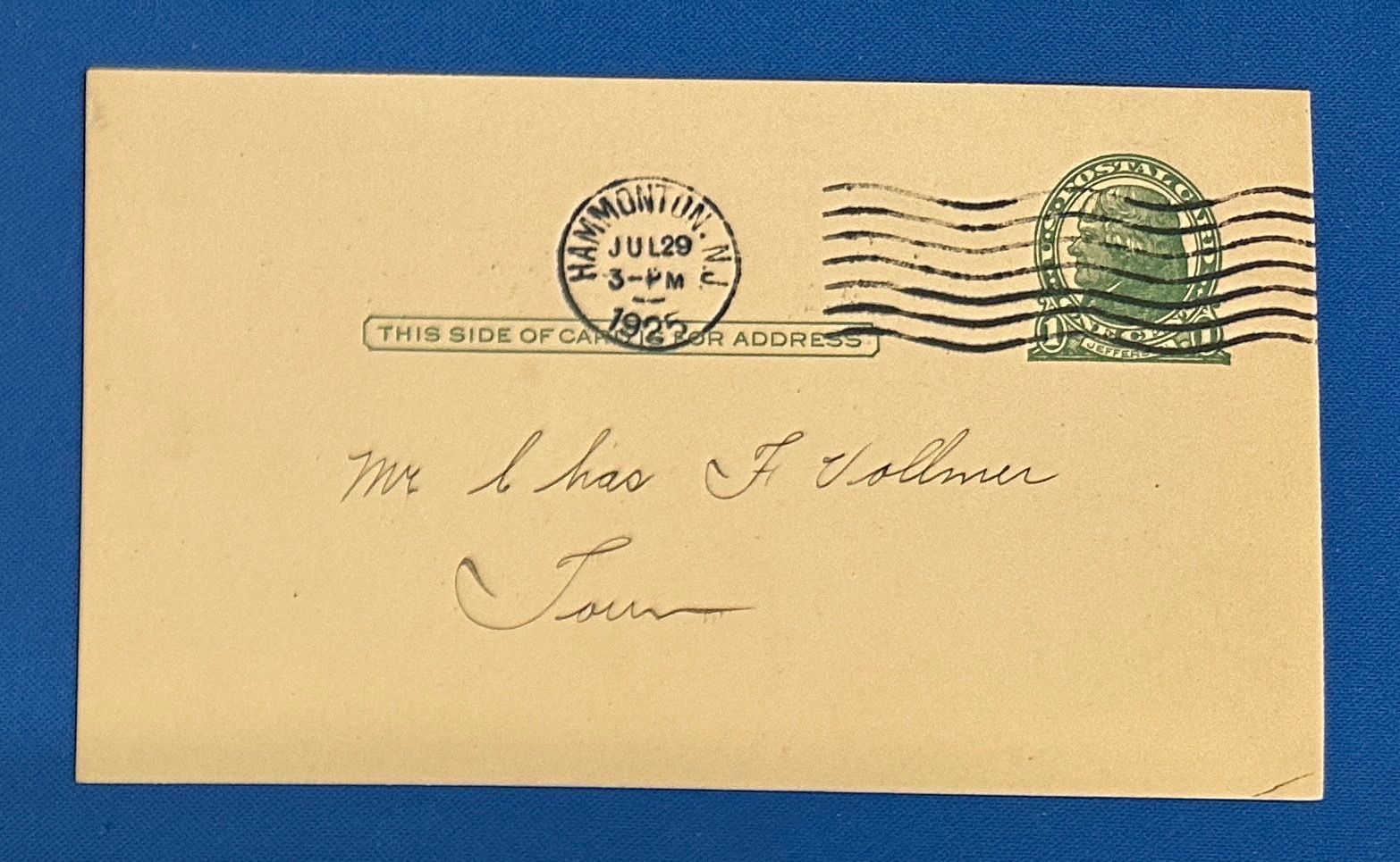 One Cent Postcard, prepaid stamped Thomas Jerfferson, postmarked July 29, 1925. Note the address is Mr. Chas F. Vollmer, Town. No street address or name of town! Sender is the People’s Bank requesting Mr. Vollmer call for account information or cancelled checks. Signed by Wilber Tilton, Cashier.Location