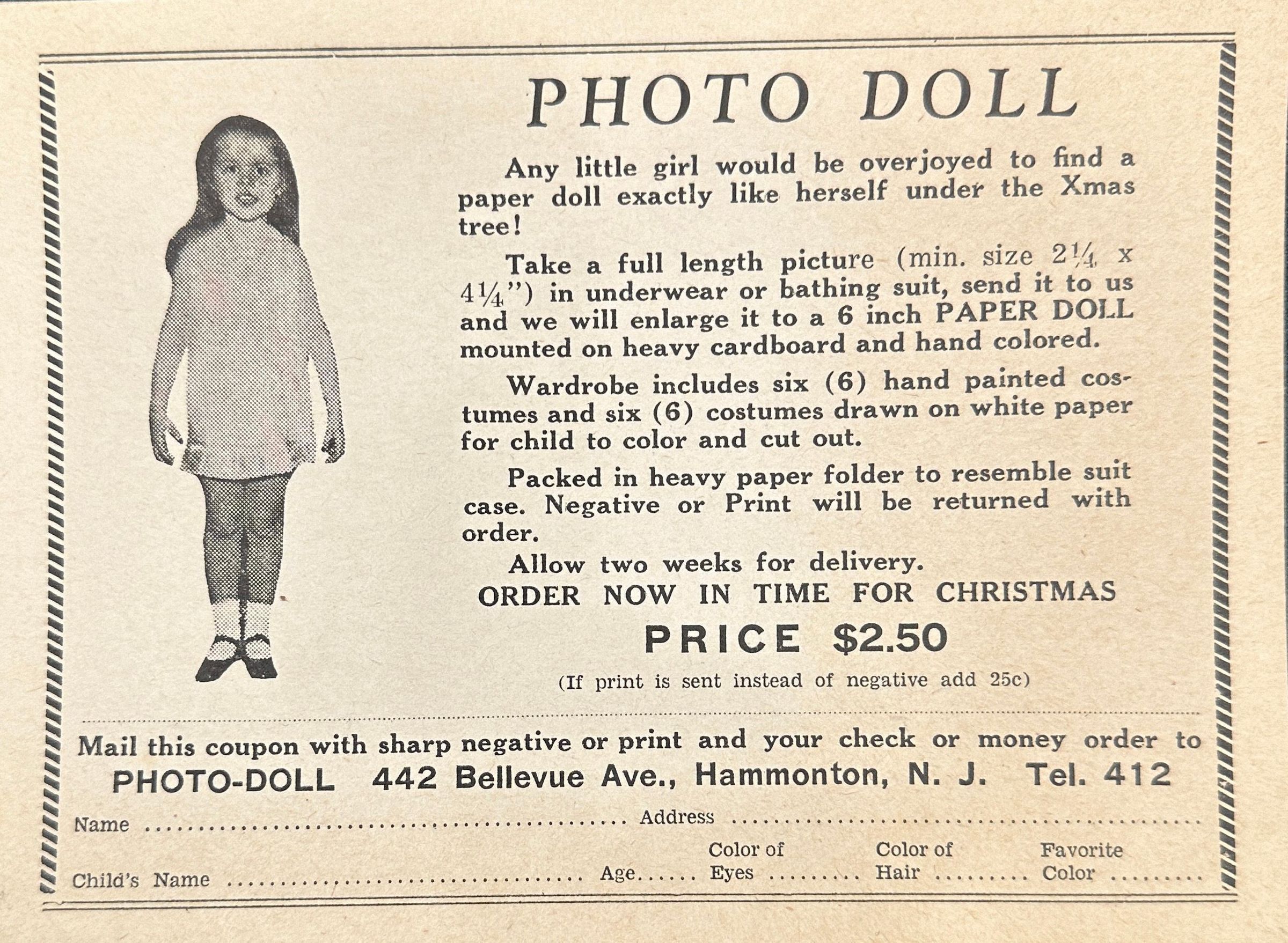 Form to order a paper doll from ‘Photo Doll’, a Hammonton based company. The paper doll is a replica of your child’s full-length photo. The 6” cardboard paper doll comes with 12 wardrobe items. Cost $2.50.Acquisition