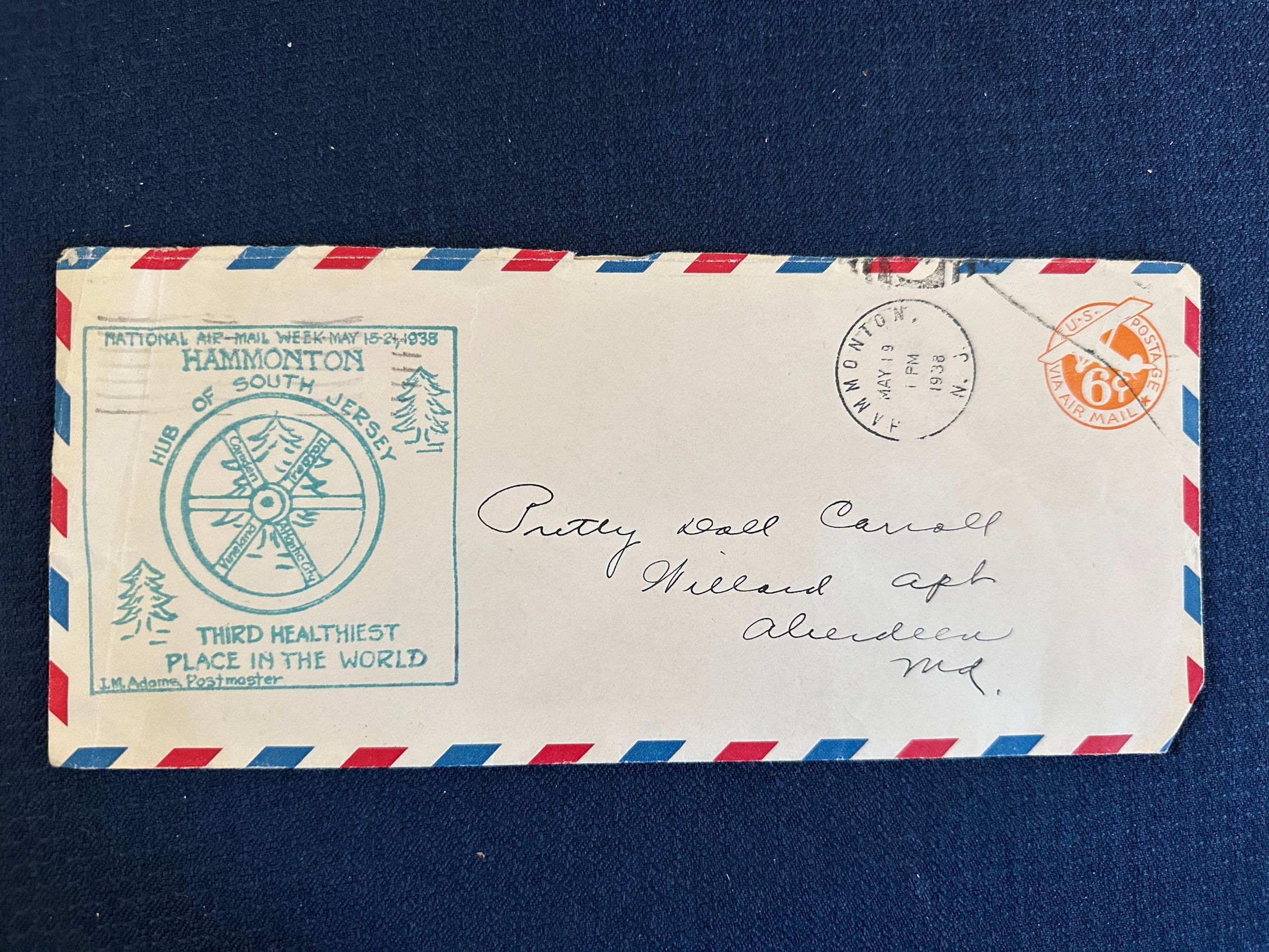 Airmail Envelope with Hammonton Stamp 1938 that states that Hammonton is the “Hub of South Jersey” and the spokes on the wheel name Camden, Trenton, Vineland, and Atlantic City. The stamp also proclaims Hammonton as the “The Third Healthiest Place in the World”. The envelope is addressed to “Pretty Doll” Carroll and the cost to post was 6 cents.