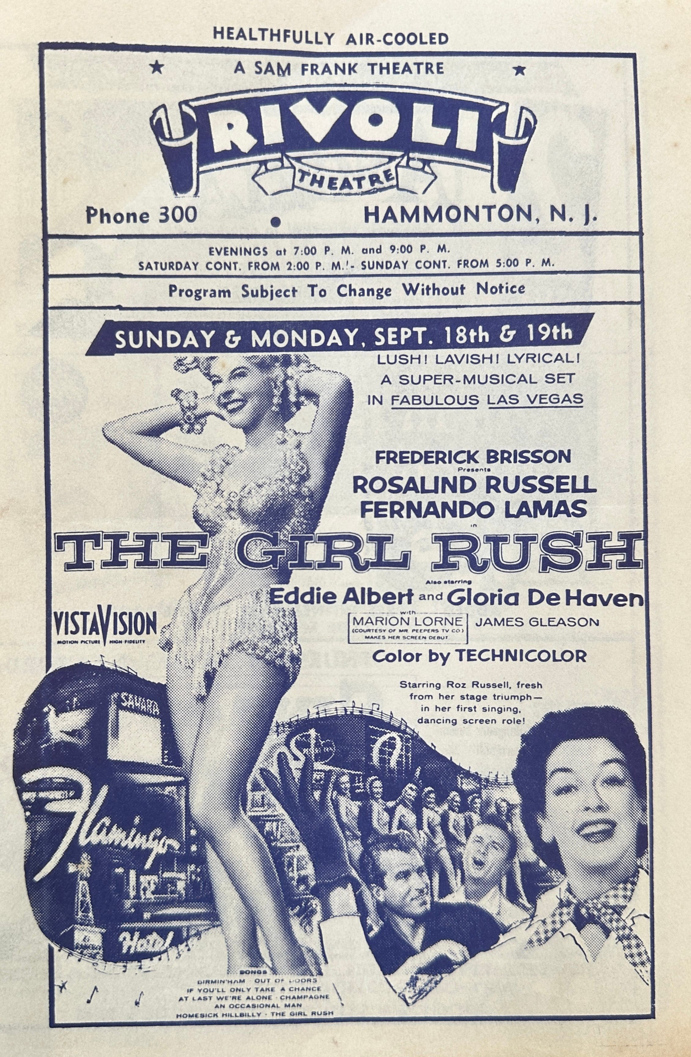 This object is a movie advertisement from the Rivoli Theater. The movie was to be shown on Sept 18th and 19th in 1955, and starred Rosalind Russell, Gloria DeHaven, Fernando Lamas, and Eddie Albert.Acquisition