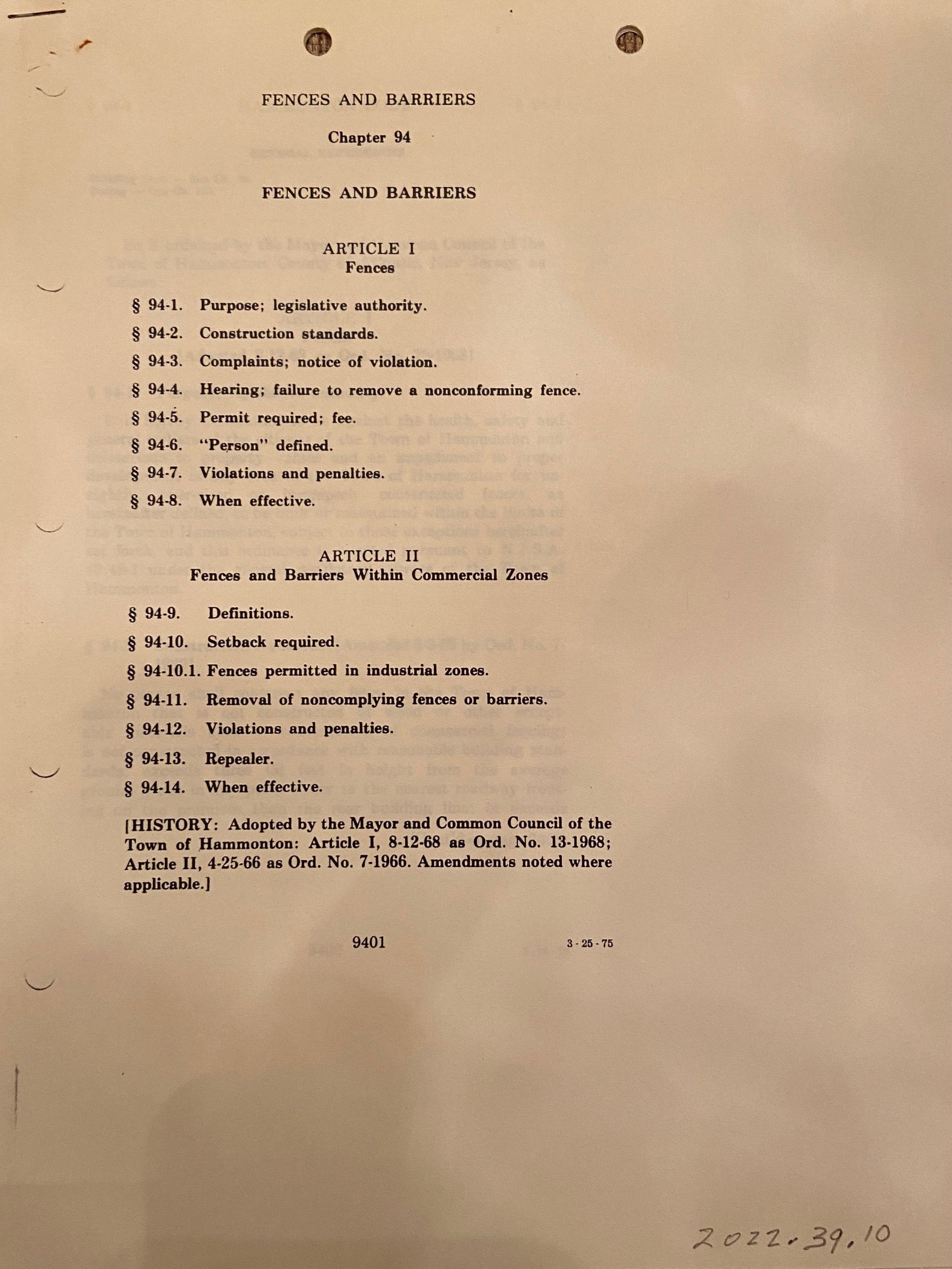 “Fences and Barriers”- Code of Hammonton, Chapter 94 adopted as Article I, 8-12-68 as Ord. No. 13-1968; Article II, 4-25-66 as Ord. No. 7-1966, pps. 9401- 9407, (printing date appears to be 3-25-75, as printed at the right-hand bottom corner of every page), from the records of Hammonton Zoning Board of Adjustment member, Vincent C. Giannini.