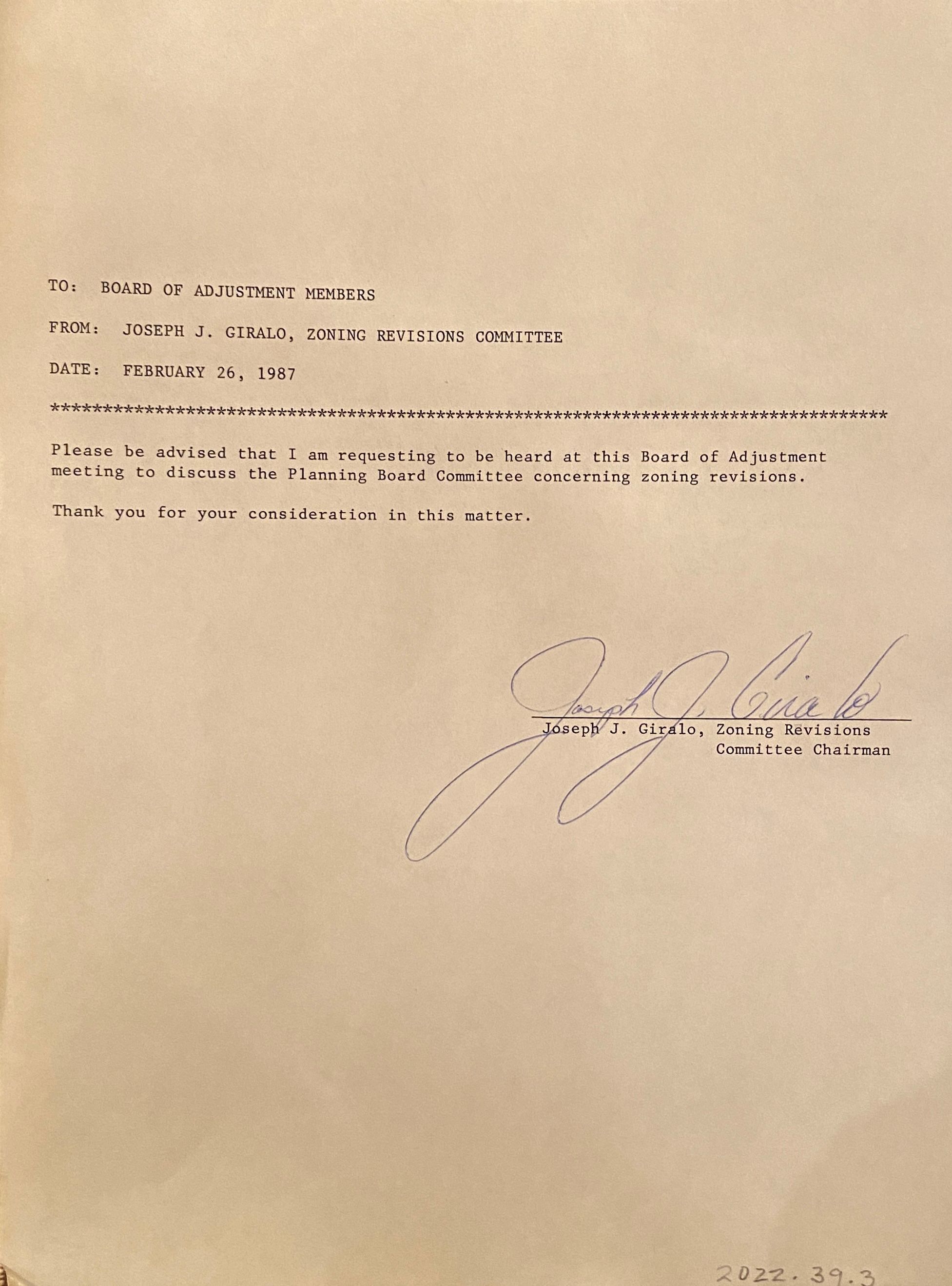 Front: Memorandum from Joseph J. Girolo dated 2/26/1987 - Zoning Revisions Committee Chairman to Board of Adjustments members Back: Handwritten notes from Vincent C. Giannini, Chairman of Hammonton Zoning Board of Adjustments