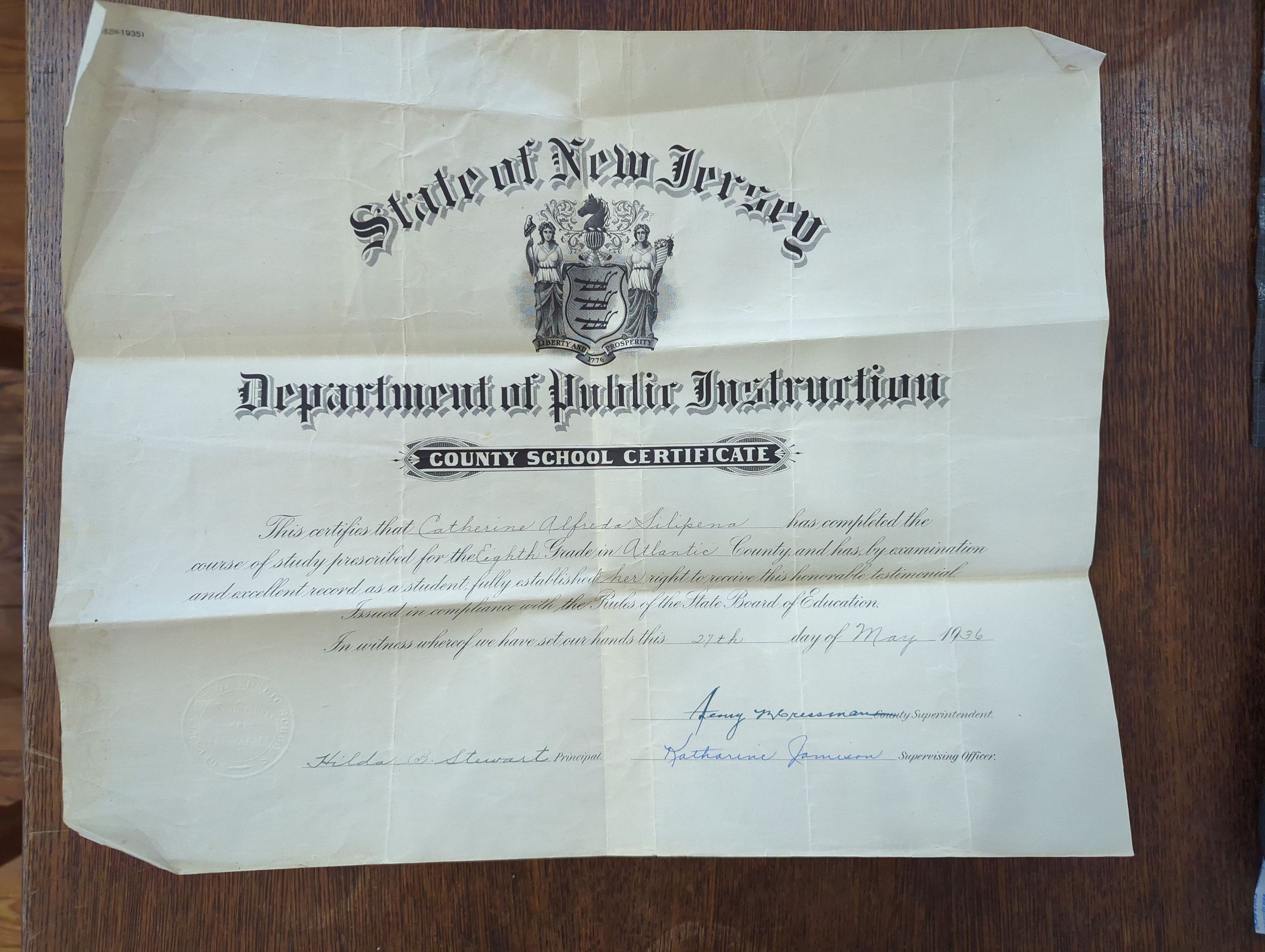 State of NJ County School Certificate 1936 for Catherine Silipena CristenoAcquisition