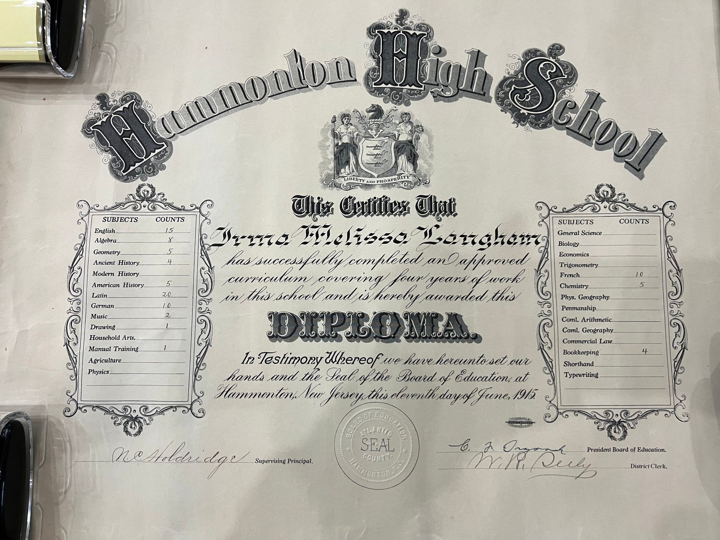 1915 Hammonton High School Diploma awarded to Irma Melissa Langham dated June 7, 1915Acquisition