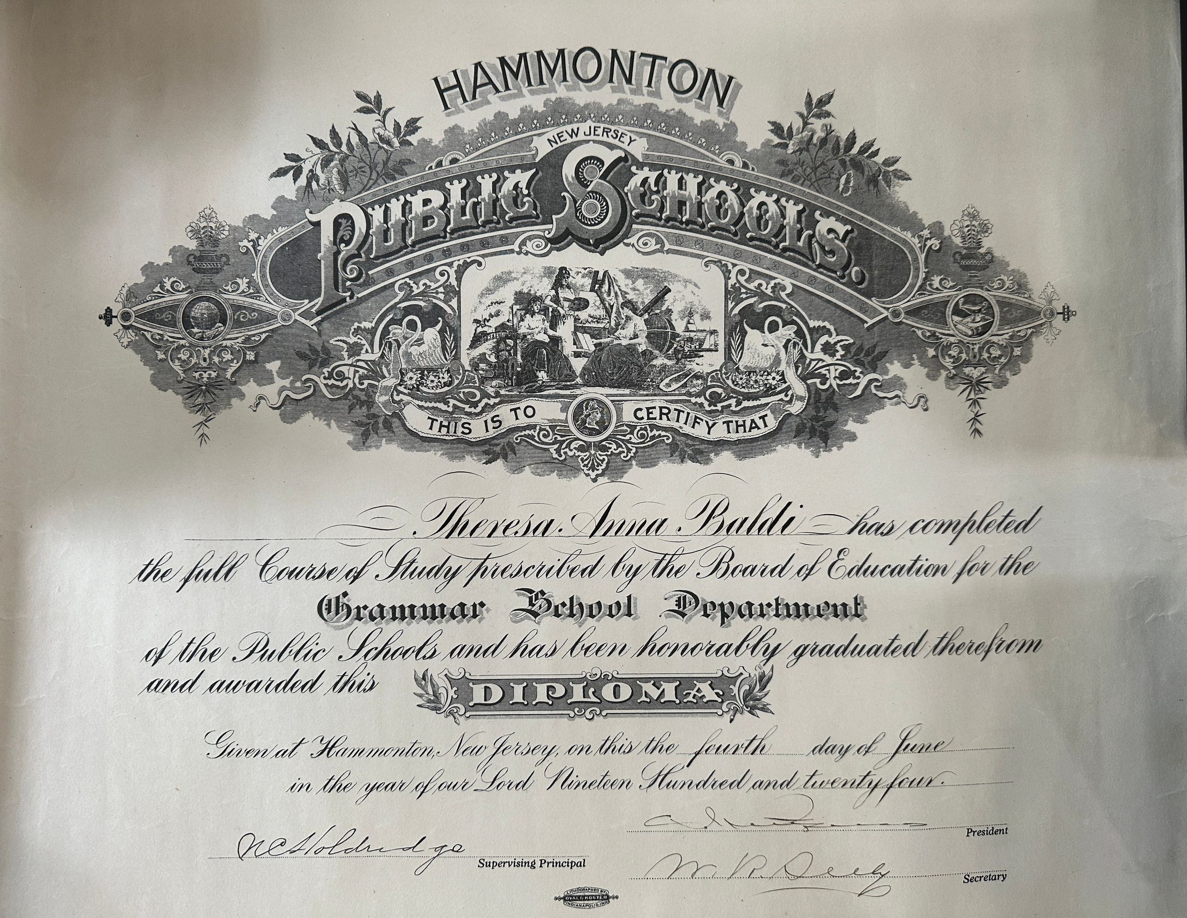 1924 Grammar School Diploma for Theresa Anna Baldi