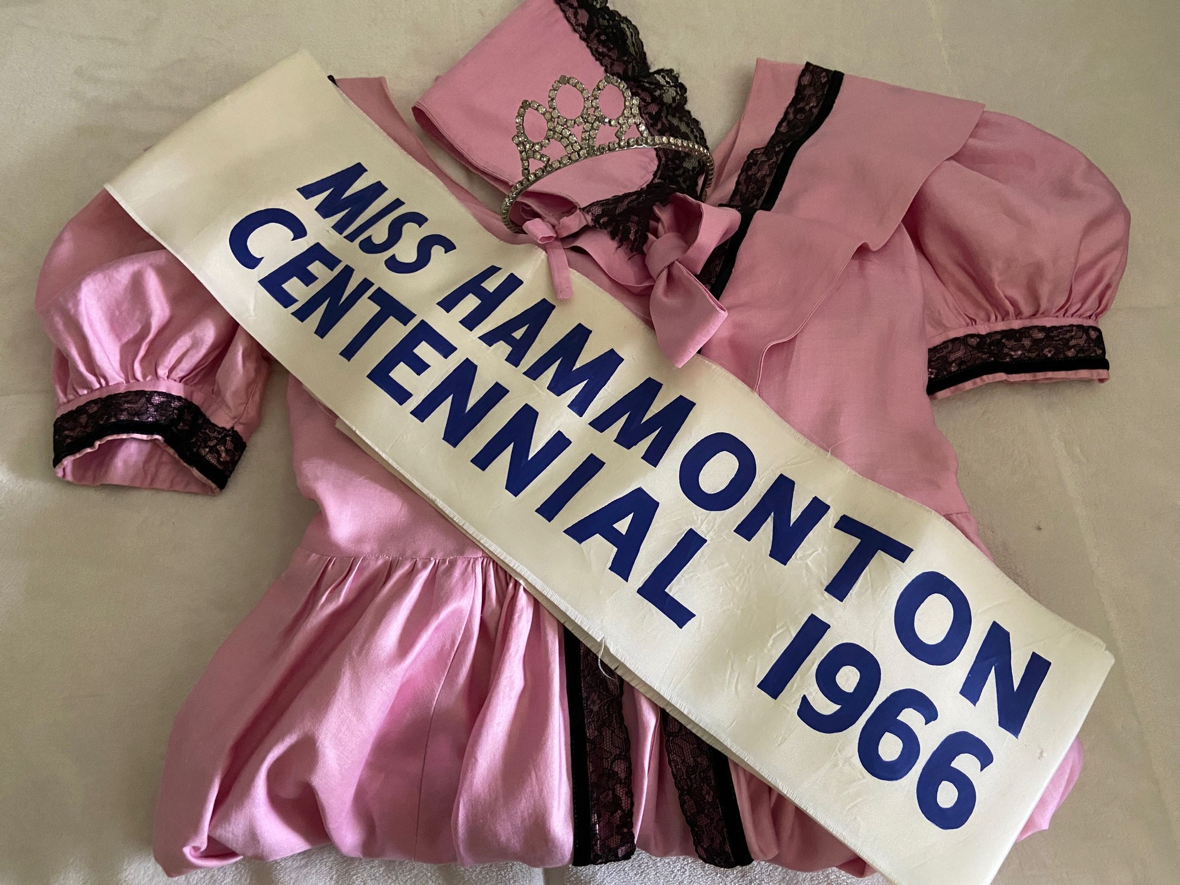 Garments worn by Charlotte DeMarco when awarded title of Miss Hammonton Centennial 1966, photos and news clippings of crowning 2023.25.1.1- Dress 2023.25.1.2- Sash 2023.25.1.3- Bonnet 2023.25.1.4- Crown 2023.25.1.5- Official photo of Miss Hammonton Centennial 1966 2023.25.1.6- Collection of photos and newspaper clippings of crowning and ceremony Miss