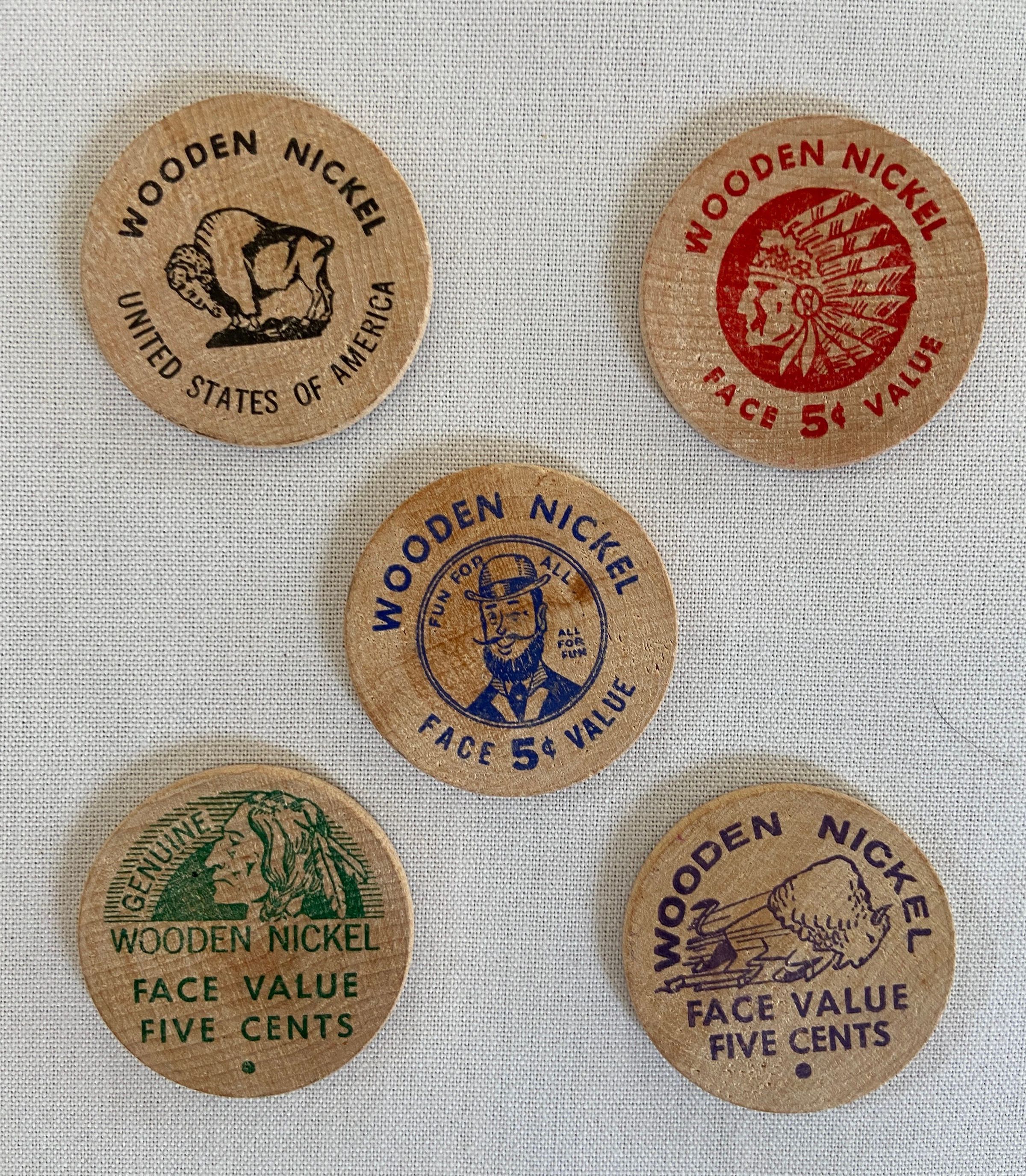 Five (5) different wooden nickels issued by the Hammonton Centennial Headquarters in 1966. Each circular wooden nickel is composed of natural wood 1/8" thick and 1-1/2" in diameter. Each wooden nickel bears printing in a single color. The ink color differs on each nickel: red; blue; green, purple, black. OBVERSE (heads side): 2023.24.5.1- Red-ink Wooden Nickel - Center motif is a left-facing male native American head wearing a war bonnet. Around the circumference is stated "WOODEN NICKEL" at the top and "FACE 5¢ VALUE" at the bottom. 2023.24.5.2- Blue-ink Wooden Nickel - Center motif inside a circle is a bust of a front-facing bearded man wearing a derby head, with the phrase "FUN FOR ALL above the head inside the circle and the phrase "ALL FOR FUN" above the bust's right shoulder. Around the circumference but outside the center motif's circle is stated "WOODEN NICKEL" at the top and "FACE 5¢ VALUE" at the bottom. 2023.24.5.3- Green-ink Wooden Nickel - Top-half motif is a left-facing male native American head wearing two feathers in his hair, with the word "GENUINE" following an arc along the wooden nickel's circumference in front of the native American's face. Completing the top half motif, across the middle of the wooden nickel are the words "WOODEN NICKEL", with those words below the native American head. At the bottom half are the words "FACE VALUE" above the words "FIVE CENTS", and a conspicuous dot centered near the bottom edge. 2023.24.5.4 - Purple-ink Wooden Nickel - Top-half motif is a right-facing, charging buffalo (American bison), with the words" WOODEN NICKEL" following the top half of the wooden nickel's circumference above the motif. At the bottom half are the words "FACE VALUE" above the words "FIVE CENTS", and a conspicuous dot centered near the bottom edge. 2023.24.5.5- Black-ink Wooden Nickel - Center motif is a right-facing, standing buffalo (American bison). Around the circumference is stated "WOODEN NICKEL" at the top and "UNITED STATES OF AMERICA" at the bottom. REVERSE (tails side): Each wooden nickel bears the same information printed on their reverse (tails) side: Around the circumference is stated "Hammonton Centennial" at the top and "1866 May 21-28 1966" at the bottom. The reverse color on each wooden nickel is the same as the wooden nickel's obverse color.