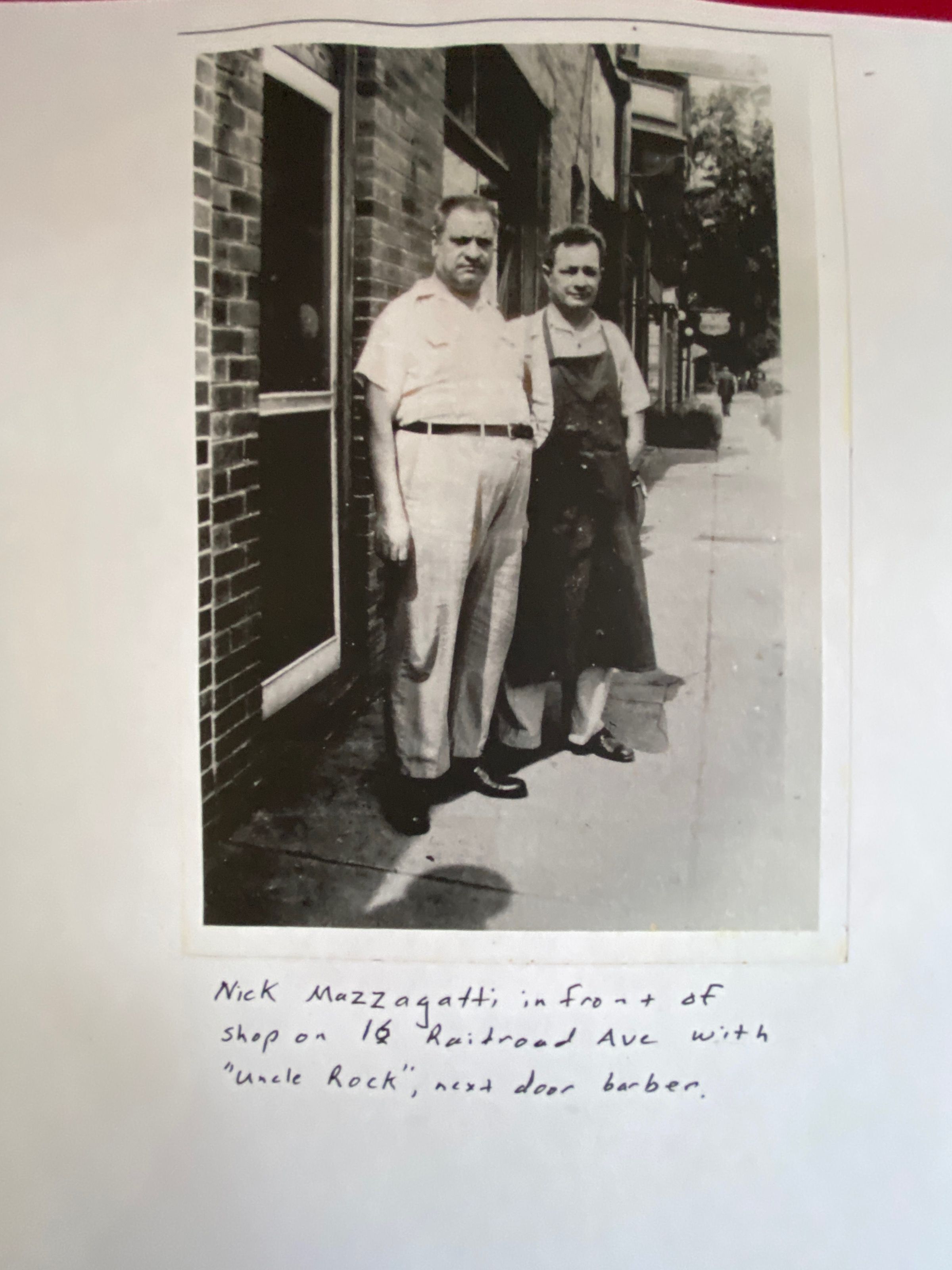 Nick Mazzagatti in front of shop (shoe repair) on 16 Railroad Ave with “Uncle Rock, next door barber