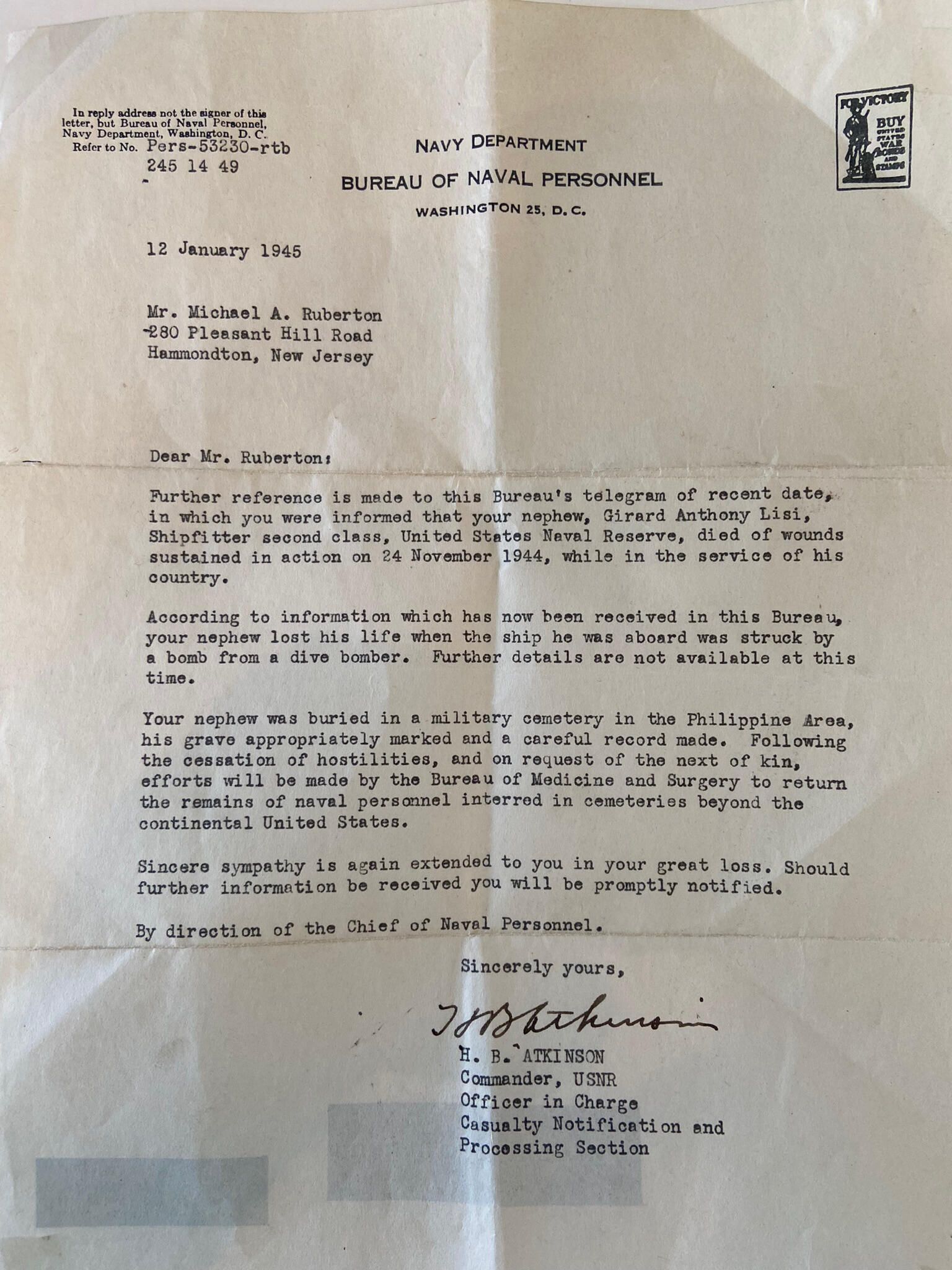 Letter from Bureau of Naval Personnel- Dated 1/12/45 regarding death of Gerard Lisi