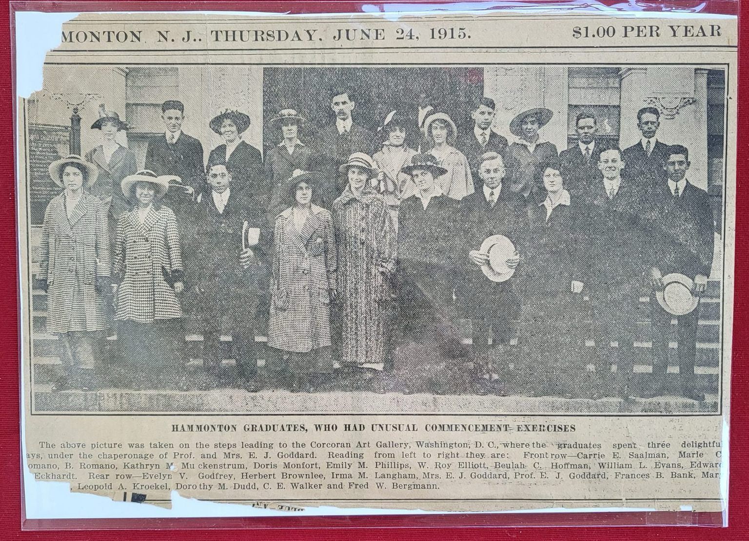 1915 HHS Class at Corcoran Art Gallery. Newspaper article dated June 14, 1915 describing the graduating class of Hammonton High School's trip to Washington D.C.