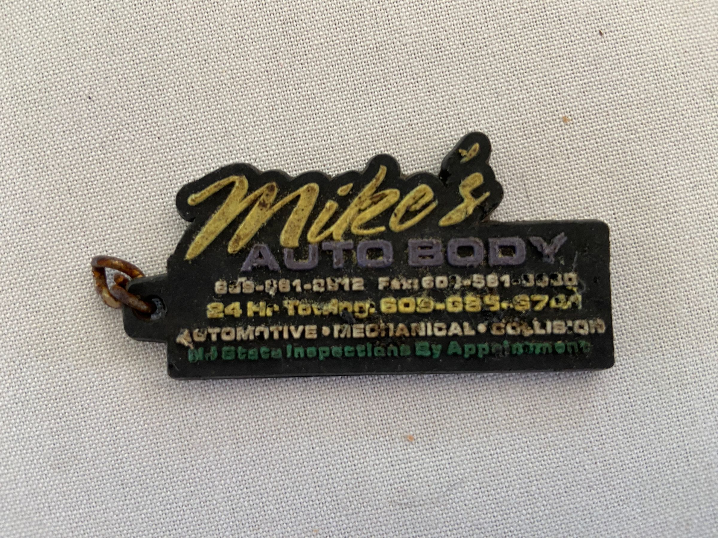 Advertising key fob. Black silicone. Mike's Auto Body is advertised on on side. Mike's Diesel Repairs is advertised on the other side. Provides businesses contact information on both sides. Located at 50 Plymouth Road, Hammonton, New Jersey.