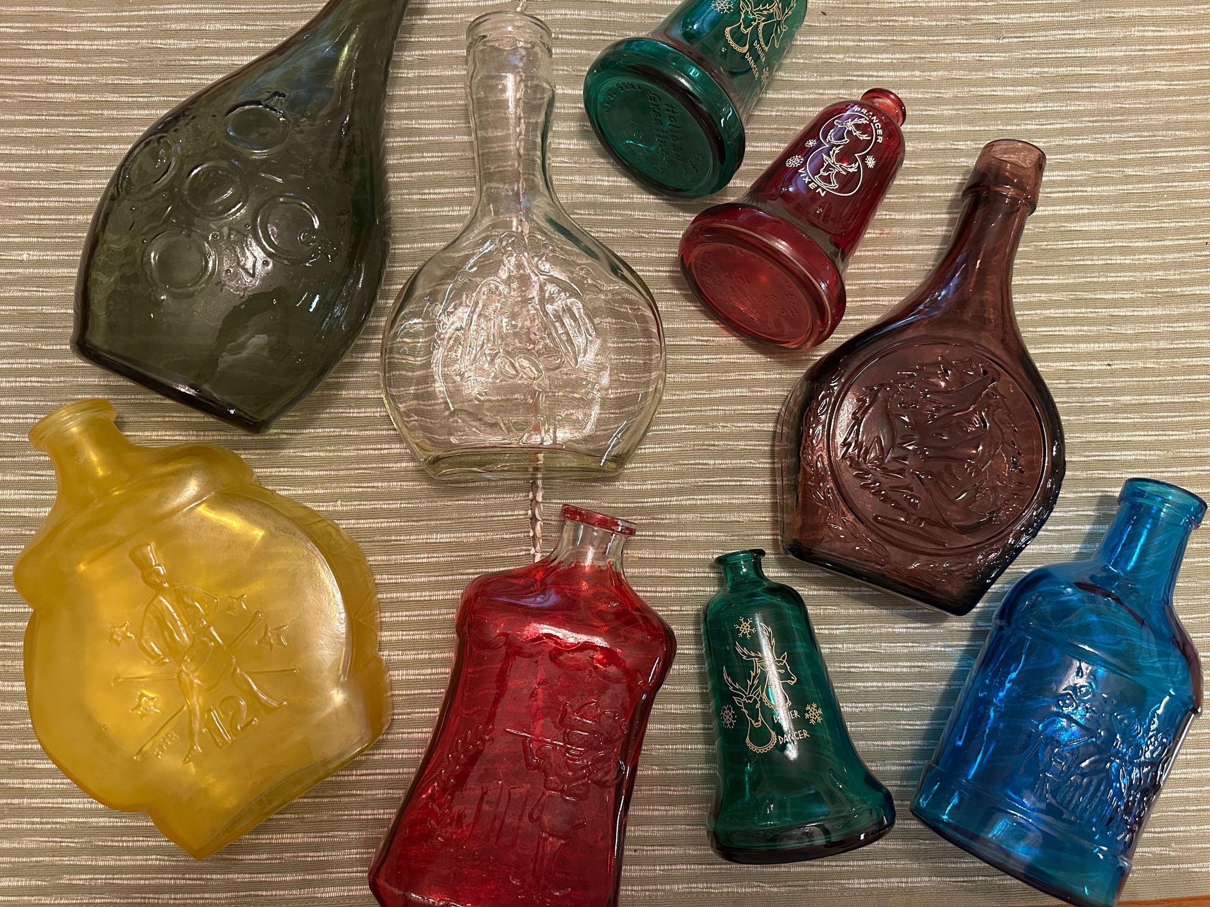 Christmas bells and flasks (12 days of Christmas) given as promotional items for opening a Christmas account at the First Fidelity Savings. 1970s-1980s. Bells and flasks were made by Wheaton Glass.