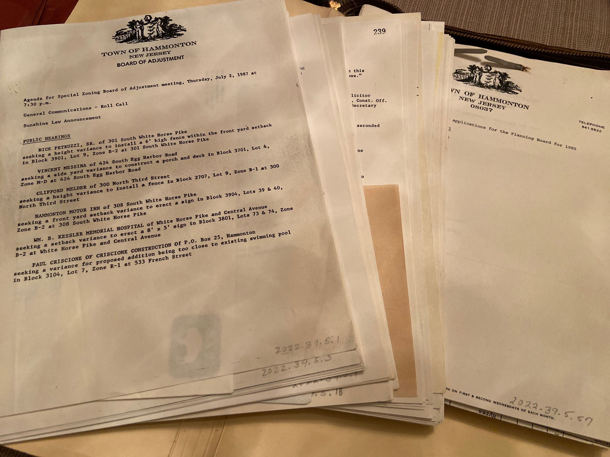 Hammonton Zoning Board of Adjustment documents Agendas, meeting minutes, letters, meeting schedules, attendance records and application form of the Hammonton Zoning Board of Adjustment, for various months during the years 1981-1987. Several of the documents have annotations hand written by Vincent Giannini as a member and later as chairman of the Zoning Board of Adjustment. 163 documents-The original file order of these donated memorandums, handwritten notes, applications, agendas, meeting notes, attendance records, newspaper clippings, has been preserved in chronological order and numbered from most recent (1987) to oldest (1981). Documents numbered 2022.39.5.1-2022.39.5.163