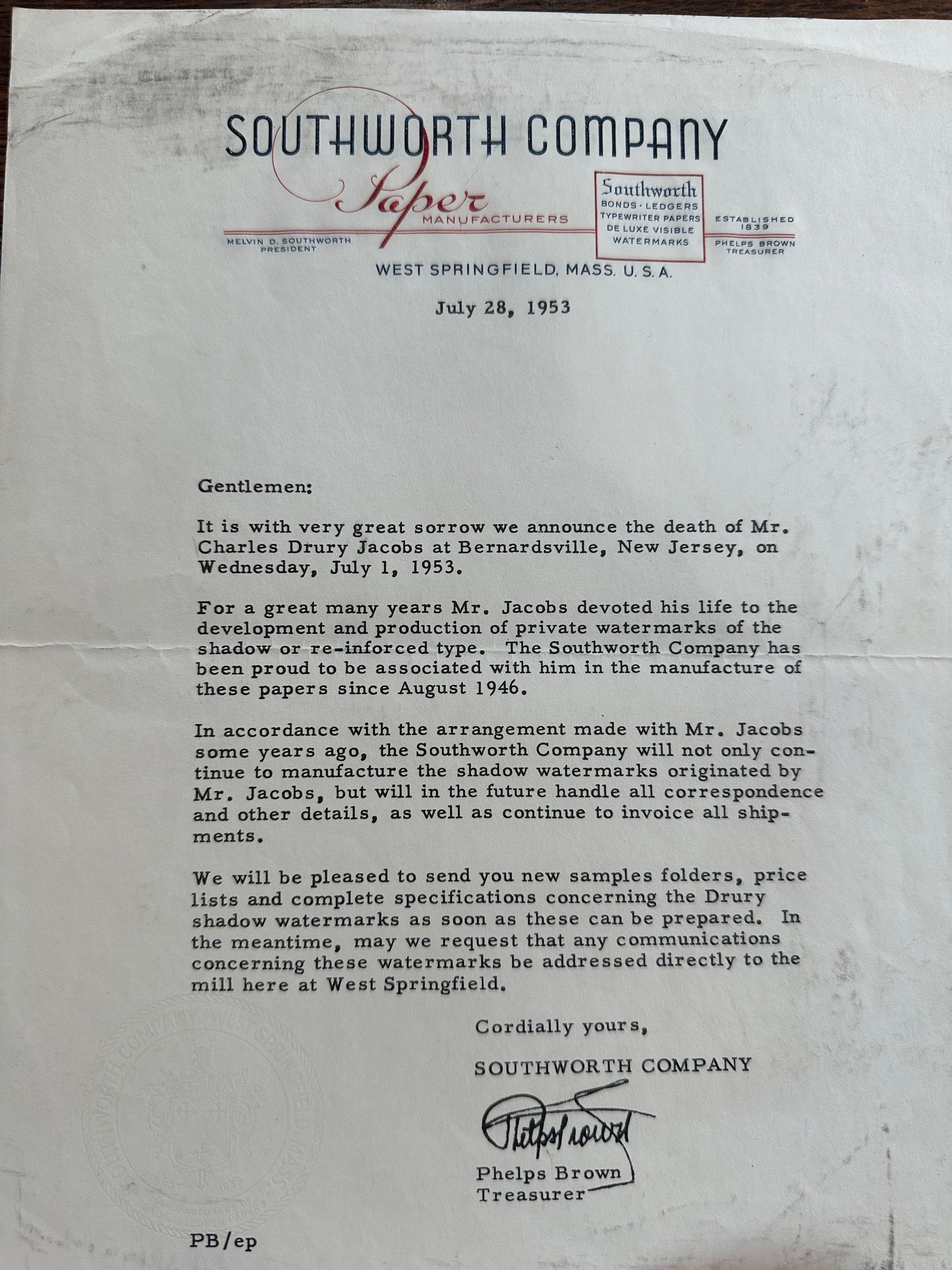 Charles Depuy Death Notice from Southworth Paper Company to customers