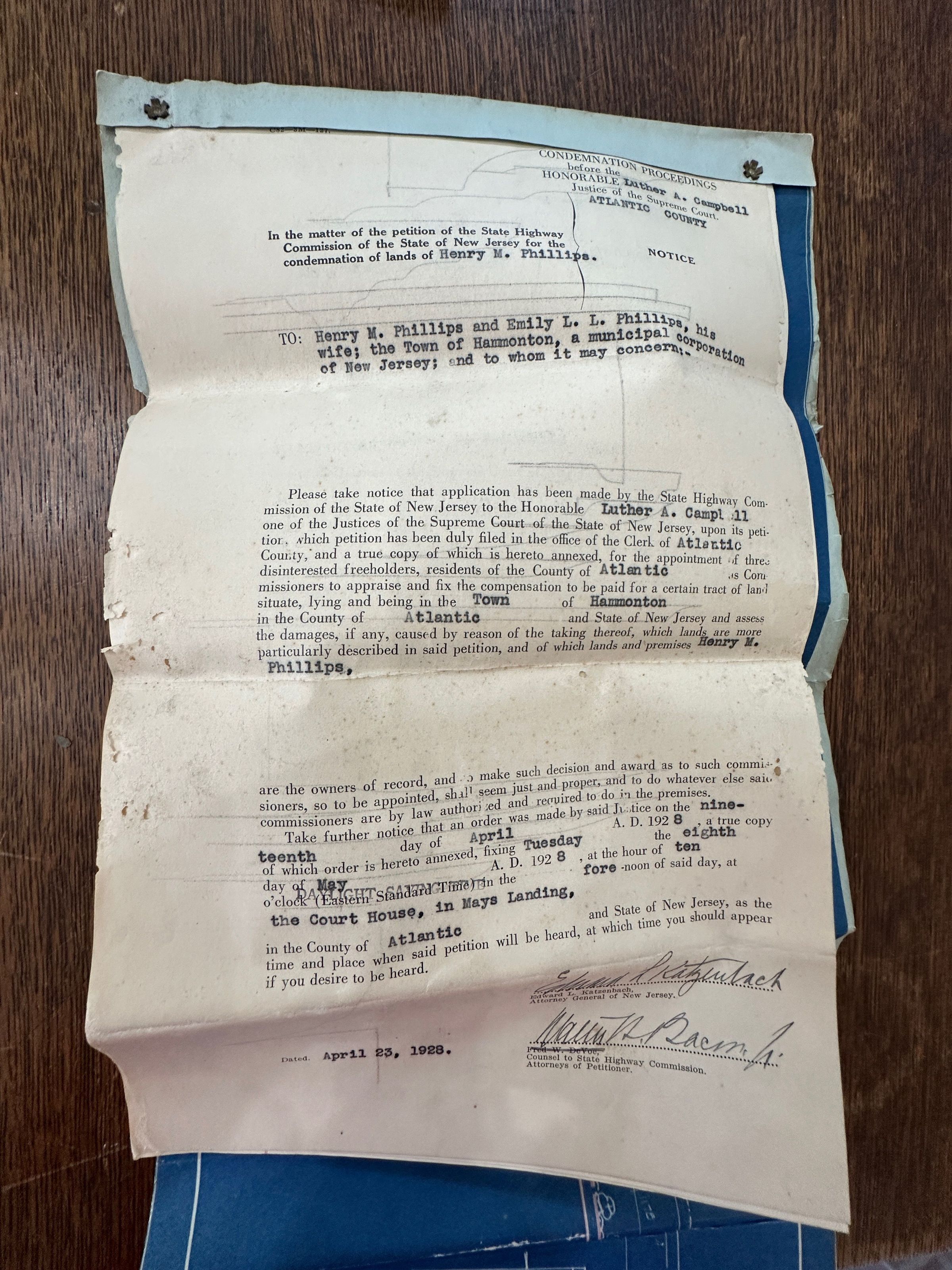 Document of NJ Supreme Ct for condemnation (imminent domain) of land belonging to Henry Phillips for purpose of expanding White Horse Pike by State Highway Commission. Description and map of land to be acquired.Acquisition