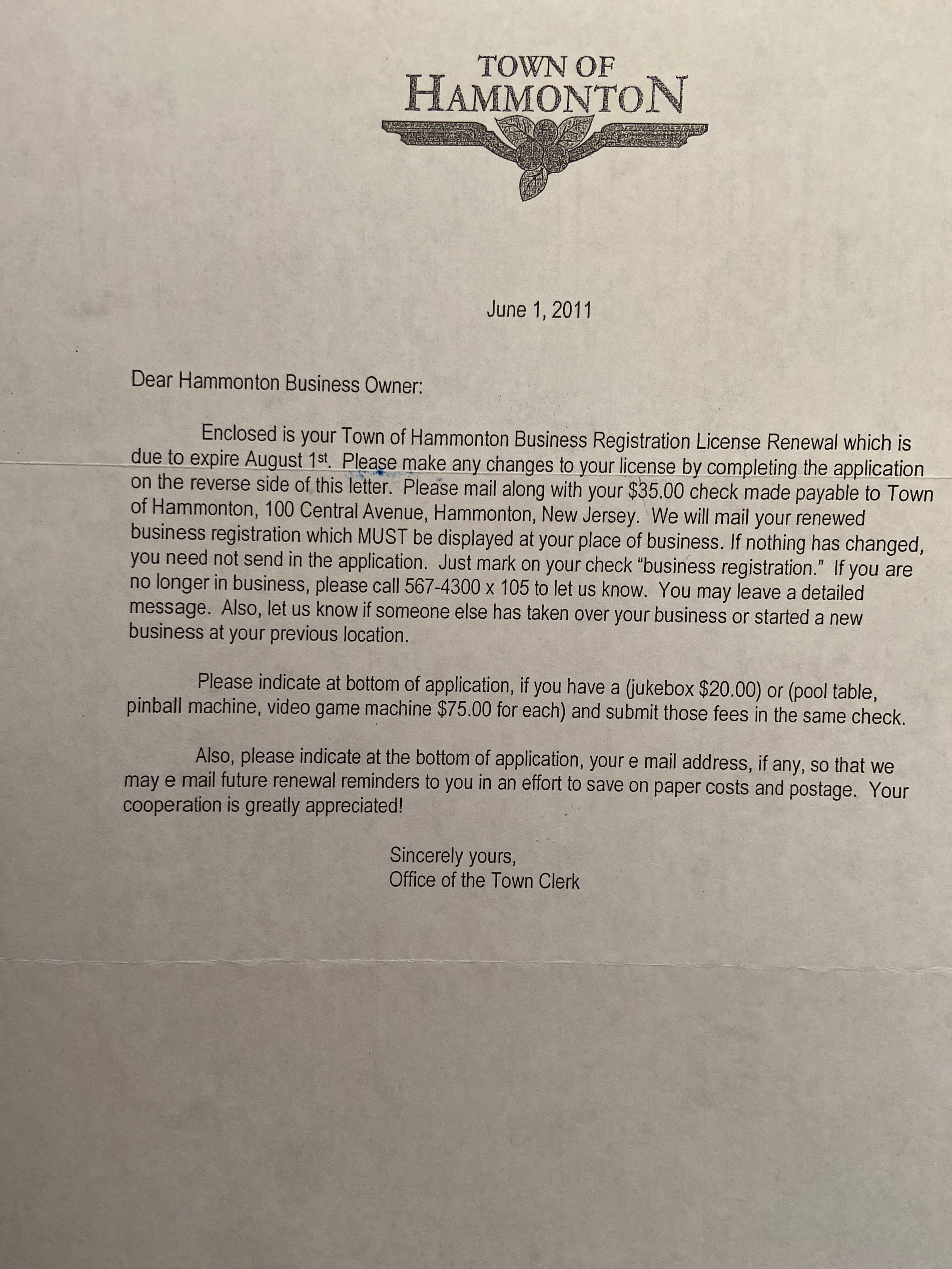 Form letter to Hammonton business owners from
