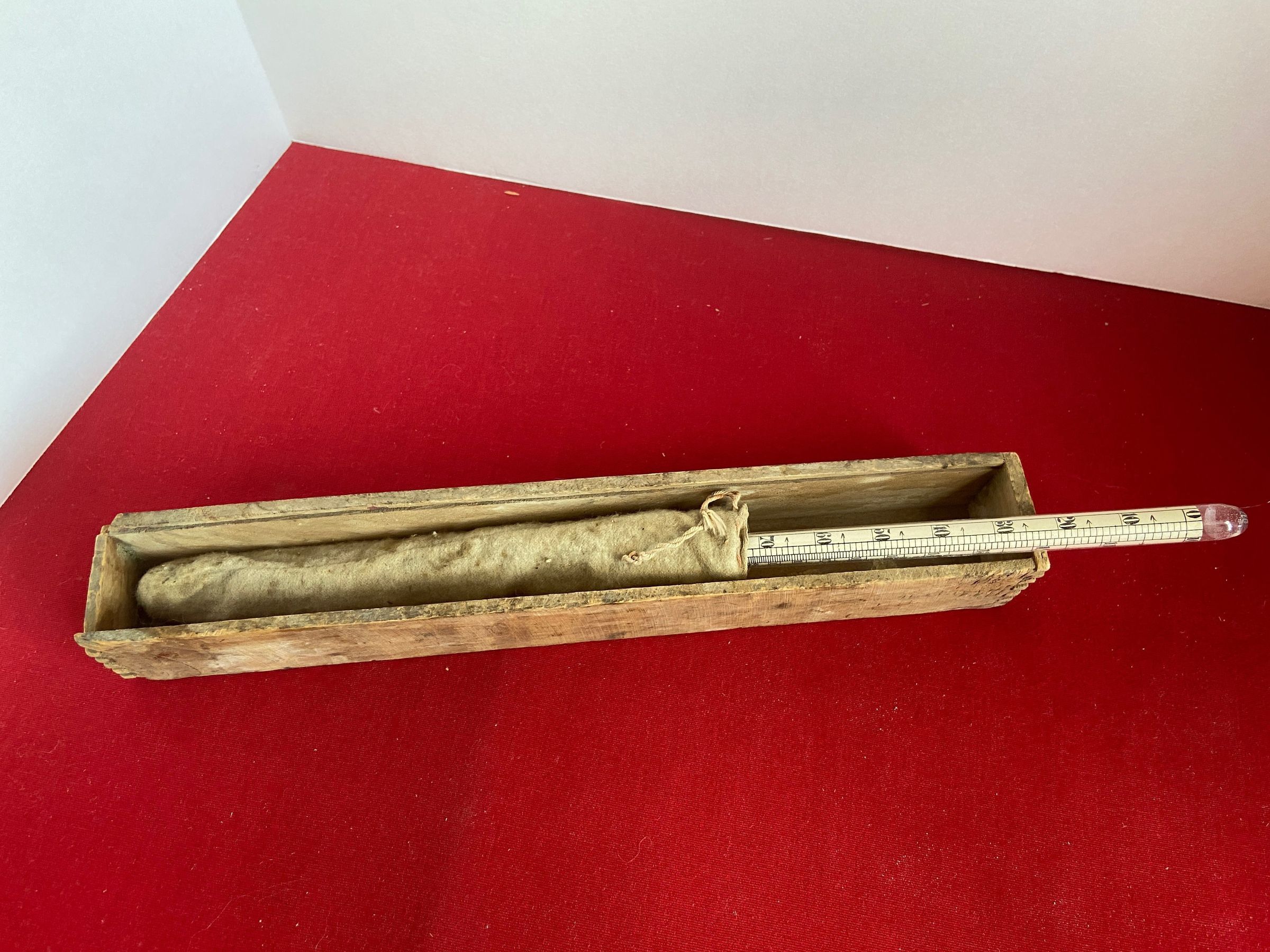 Vintage Beaume and Specific Gravity Scale, 60 degrees F, enclosed in a cloth bag and protected in a old wooden box.Acquisition
