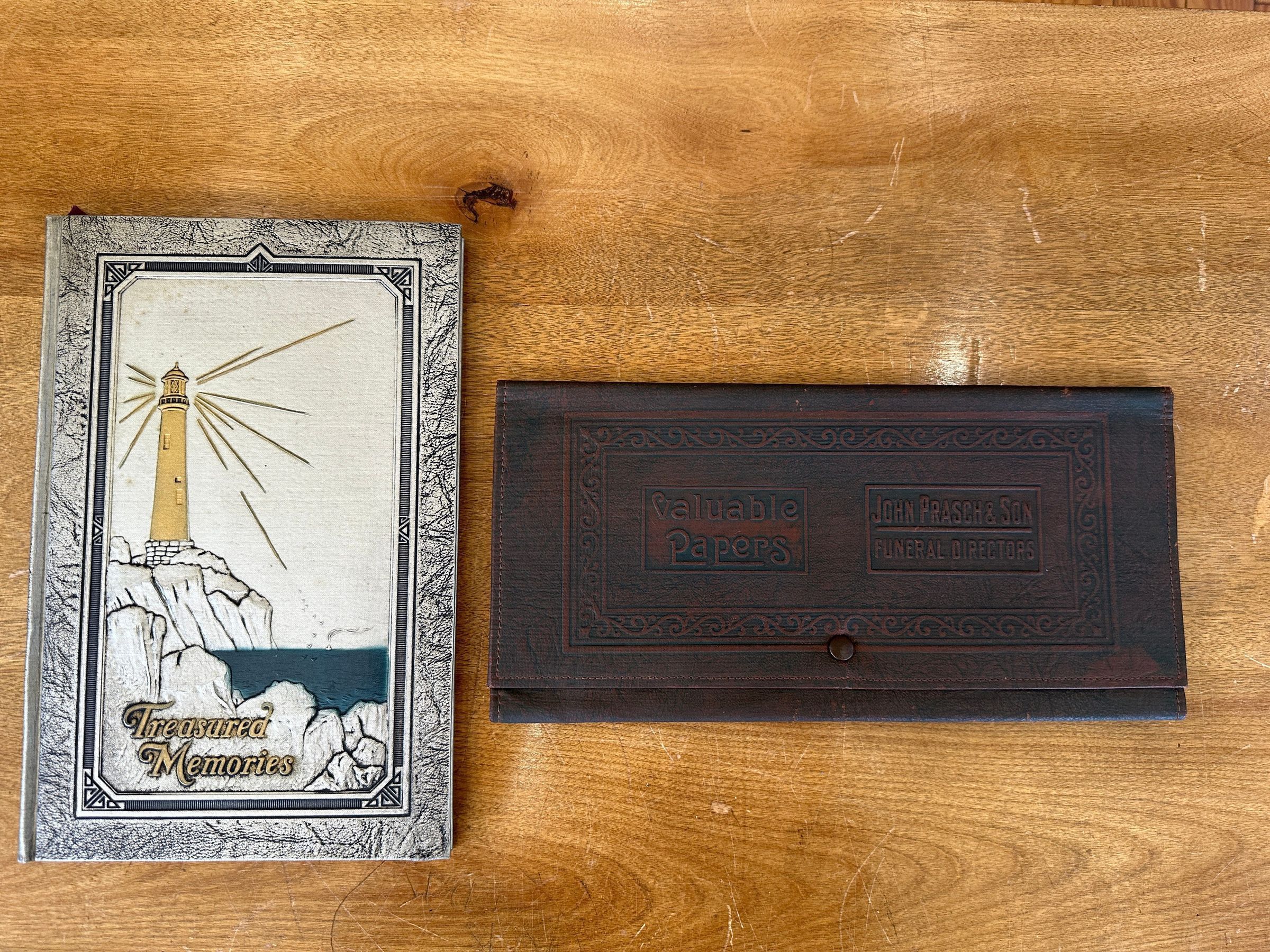 Prasch & Son Funeral Memorabilia 2024.24.3.1 - Leather folder for funeral documents 2024.24.3.2 - “Treasured Memories” Book for visitation notes and signatures from Prasch & Son Funeral Home