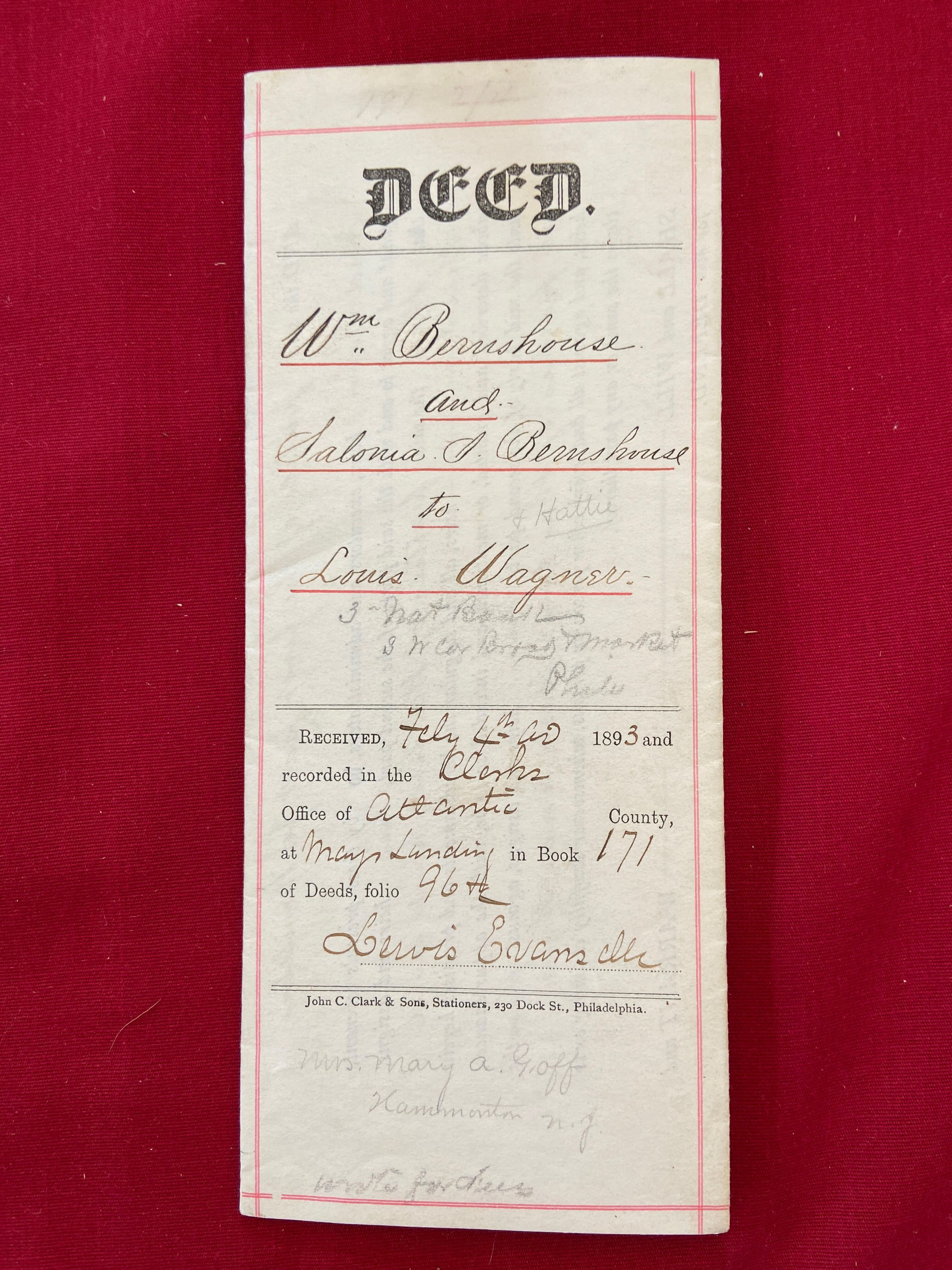 Deed 1893- Wm. & Salonia Bernshouse to Robert WagnerEntry/Object ID