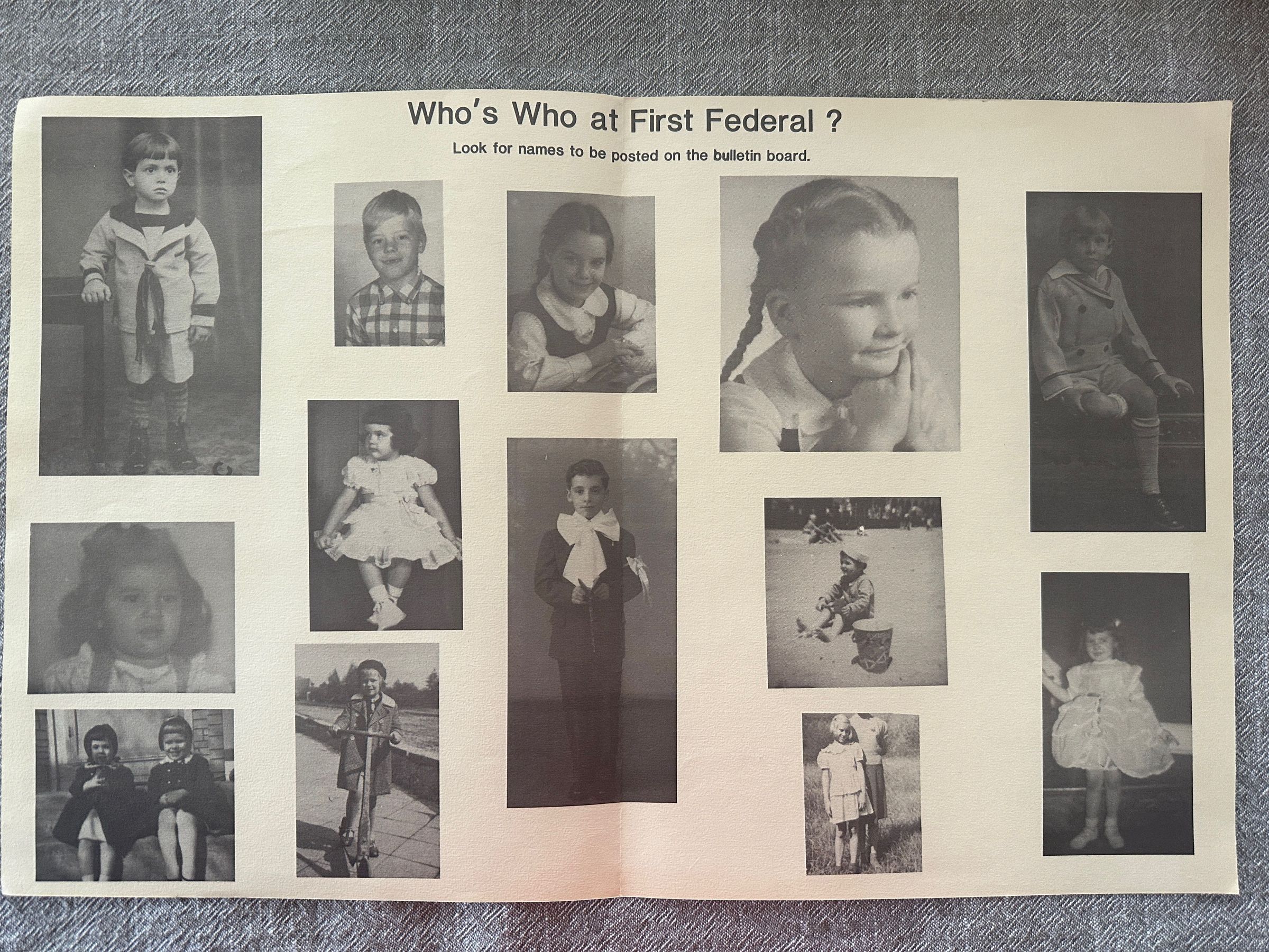 Photos of First Federal Bank employees as children. Names and positions of employees found on back.