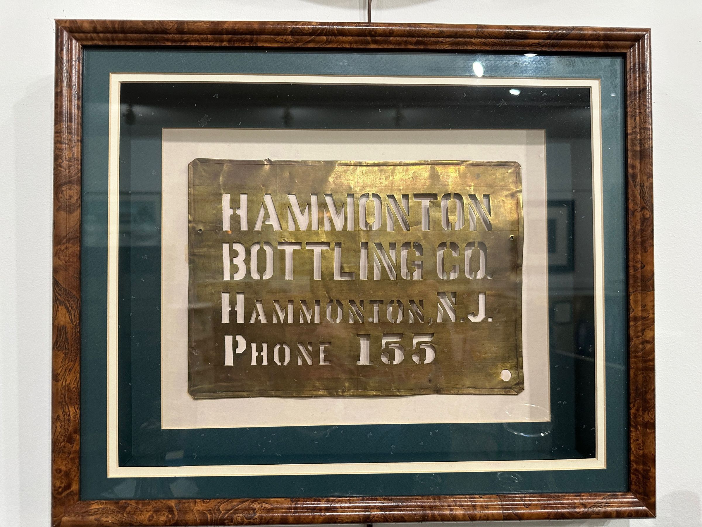 Hammonton Bottling Co Metal Sign framed in a burled wooden frame. Sign includes phone number of 155.Acquisition