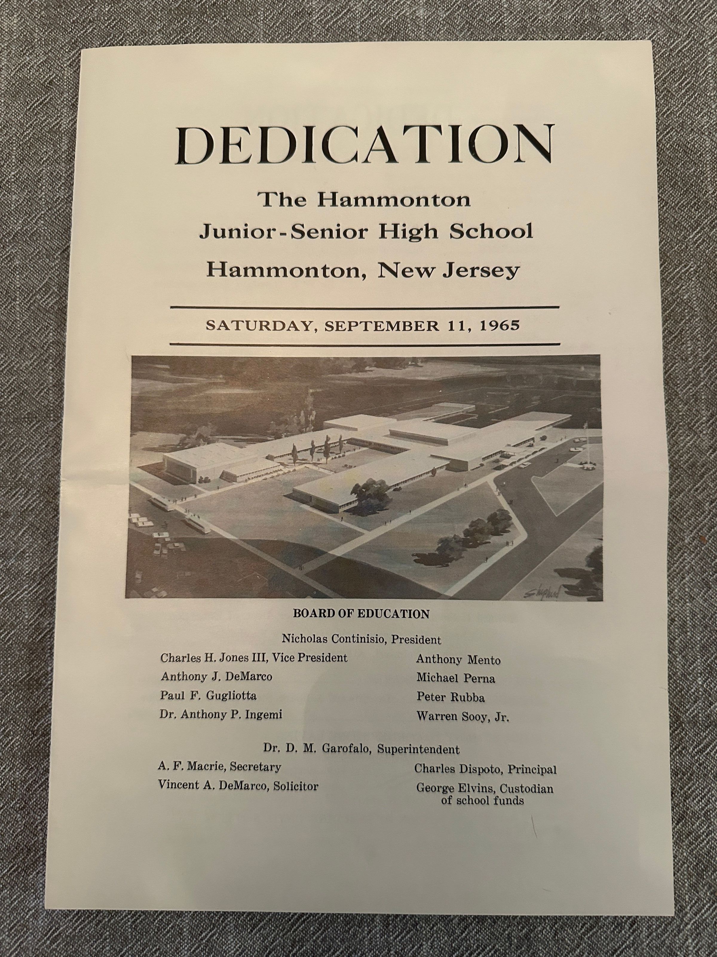 Dedication program for the Hammonton Junior-Senior High School on 9/11/1965. Charles Dispoto Sr. was the Principal of the Jr.-Sr. H.S. (later Superintendent), Nicholas Continisio was President of the Board of Education, Dr. D.M. Garafalo, Superintendent. Frank Farley was State of NJ Senator at the time.Acquisition