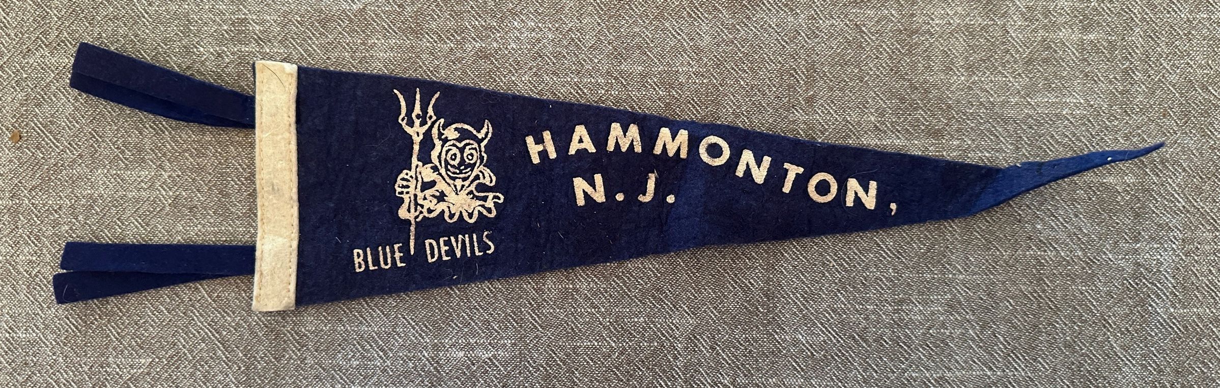 Hammonton High School Pennant- blue felt pennant with white felt lettering- Hammonton N.j. And Blue Devils. 14” from tip to endAcquisition