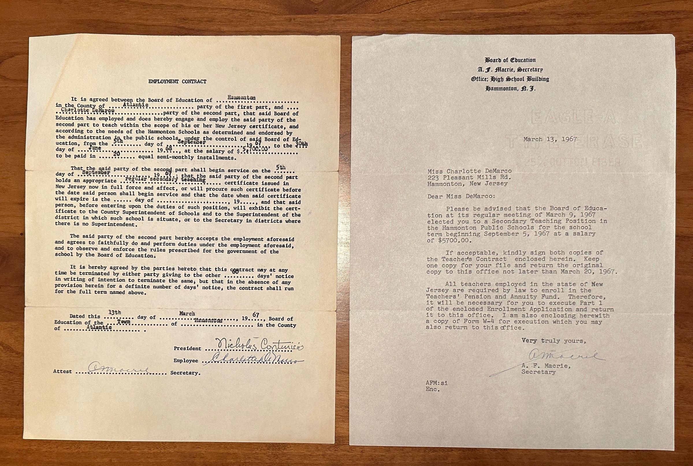 HHS Teaching Position Offer & Contract presented to Charlotte (DeMarco) Cessato, Hammonton School District, 1967