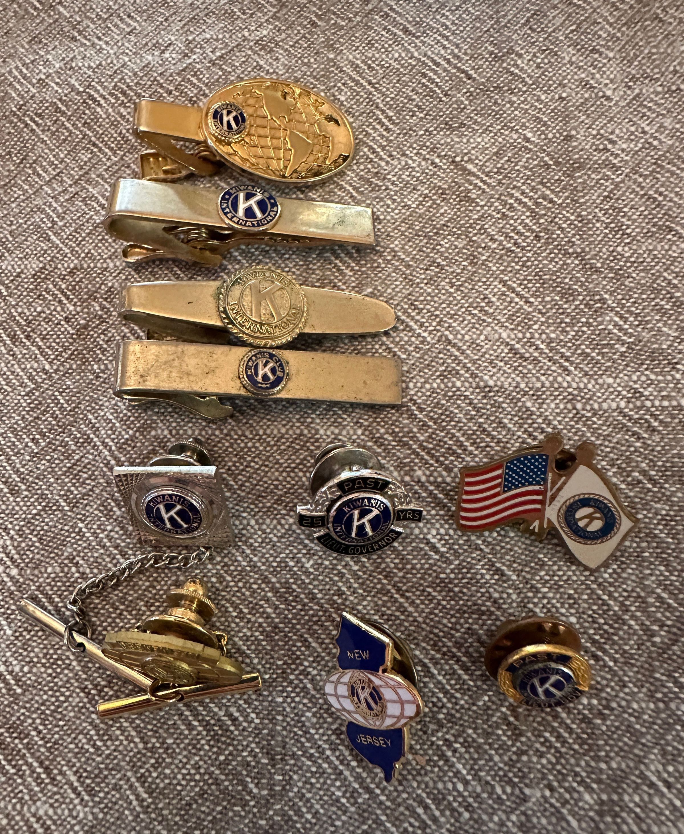 Collection of varied tie clasps and lapel pins with Kiwanis insignias