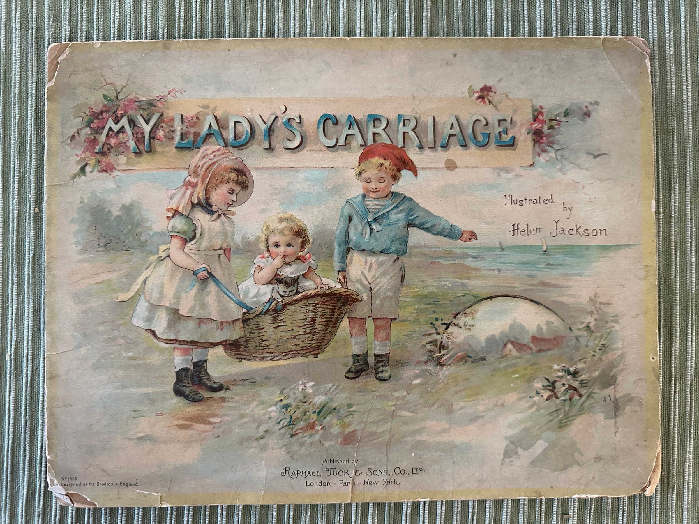 Book "My Lady's Carriage"- Paper, linen, Raphael, Tuck & Sons, Co. Ltd. London-Paris-New York. Illustrated by Helen Jackson. Name on back cover: Mildred Tell. Poor condition. Cover damage. Pages loose. 12 3/8" x 9 1/2"Acquisition