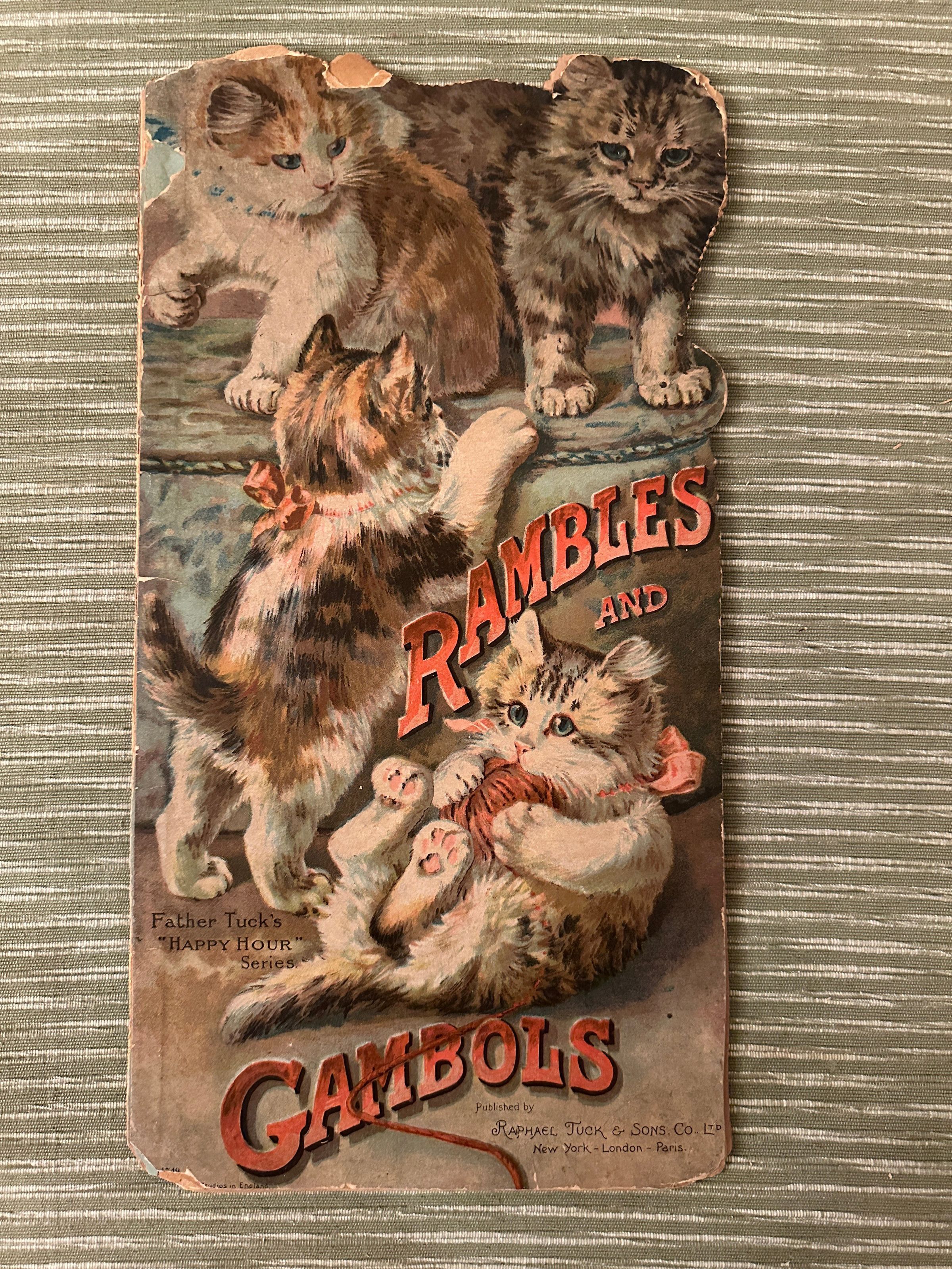 Book- “Rambles & Gambols from Father Tuck's Happy Hour' Series". Paper, linen, Raphael Tuck & Sons Co. Ltd, New York-London- Paris. Inscription: For Mildred. Poor condition, detached cover, tears, loss to corners. 14 1/4" x 7 1/4".Acquisition