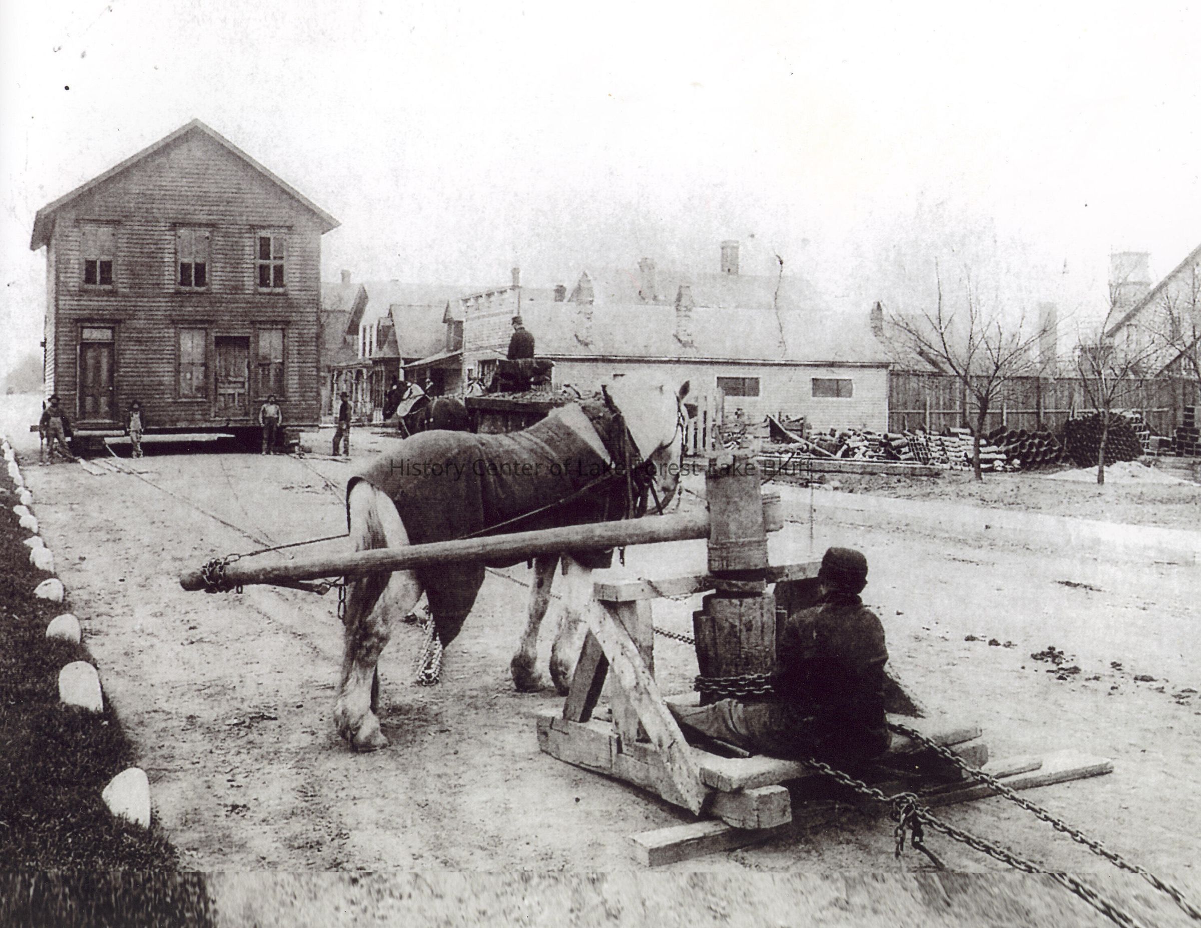 Black and white photograph (copy) showing the moving of a two-story wooden building from the site of the present Forest Bootery to McKinley Avenue. There are four men in front of the building, and a boy and horse in the foreground.