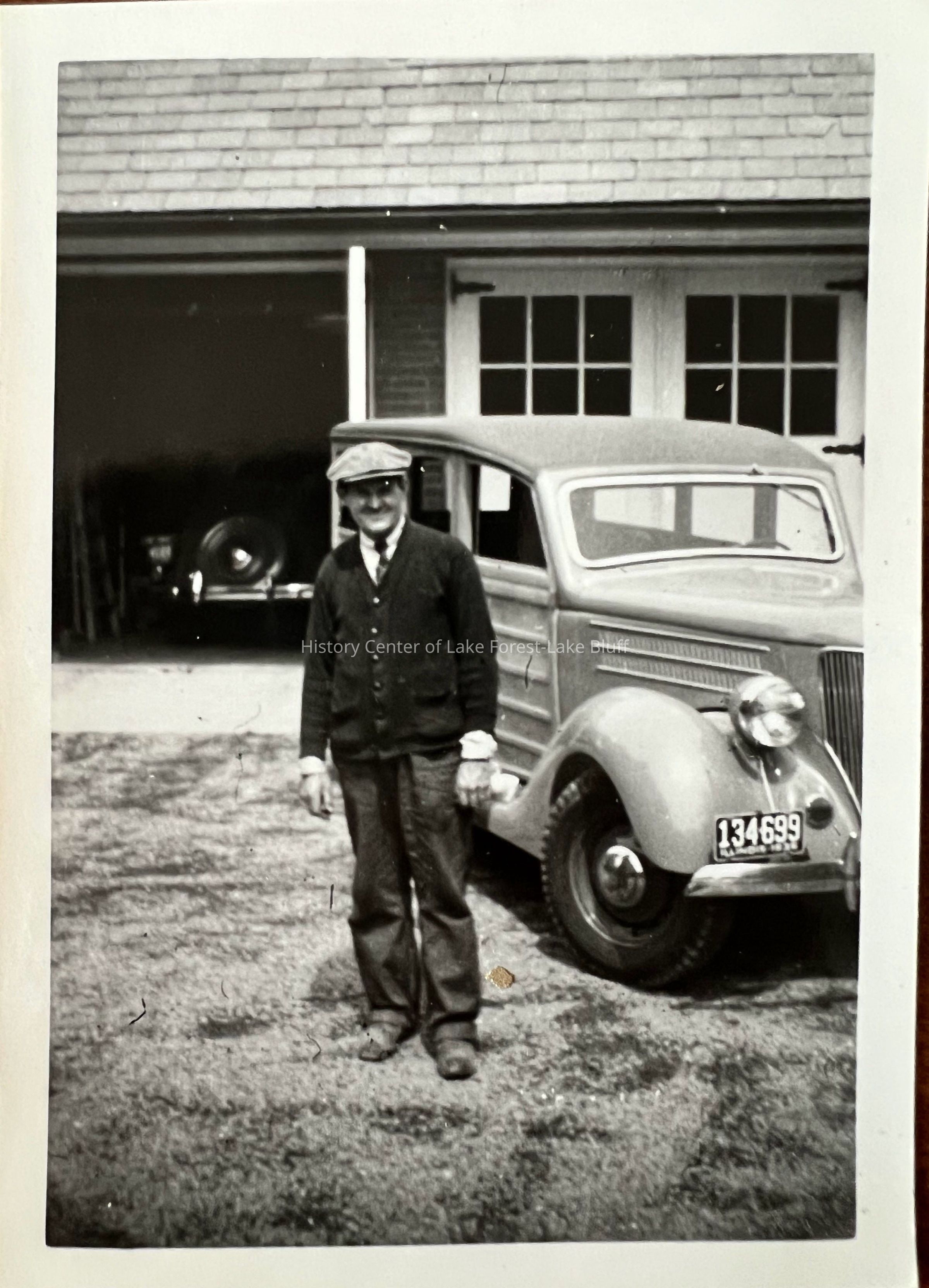 Gardener Enoch Dunn standing in front of an automobile and garage. 6 East Laurel Avenue, at the northeast corner of Laurel and Green Bay Road. Alfred T. and Mildred Wells Carton estate.