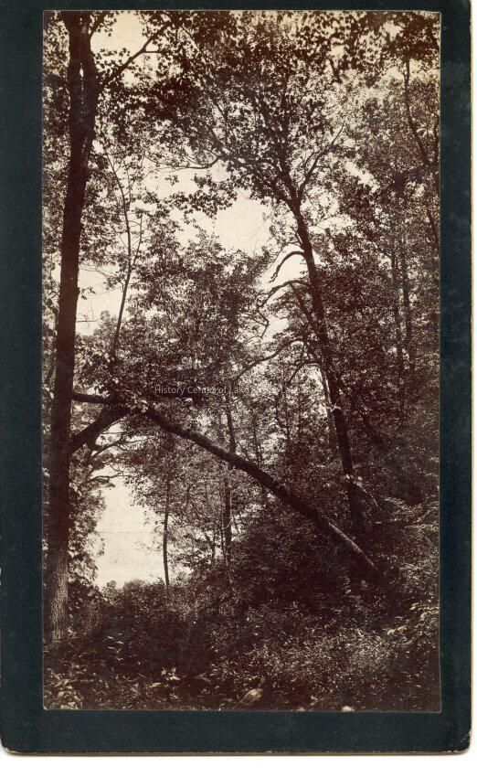 Sepia tone photograph. View of lake through trees from top of bluff. Photograph by R.B. Ludington for George Roberts. Mounted on black card.