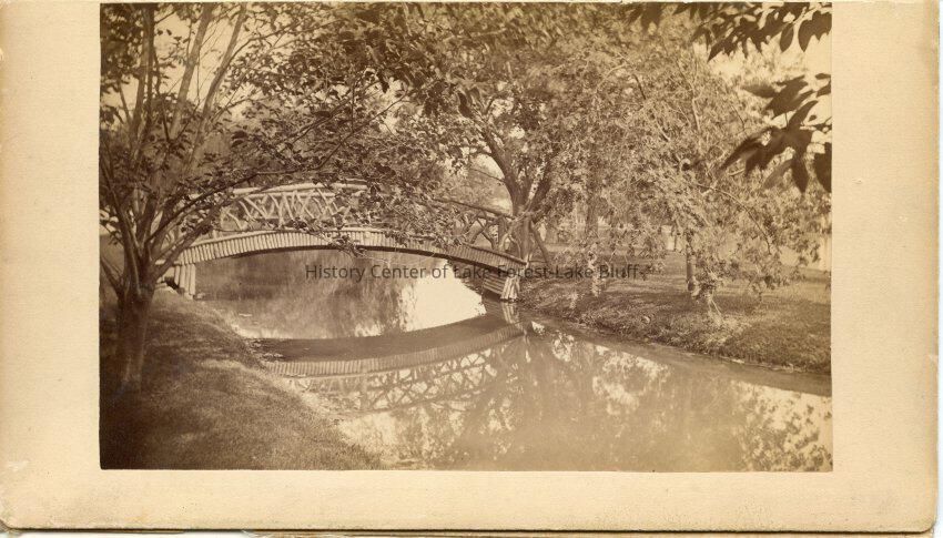 Sepia tone photograph of walking bridge over pond. Most likely Farwell estate, Fairlawn. See also 2011.25.15 and 2011.25.4. May have originally been attached to 2011.25.28 and 2011.25.29 in a photo book.