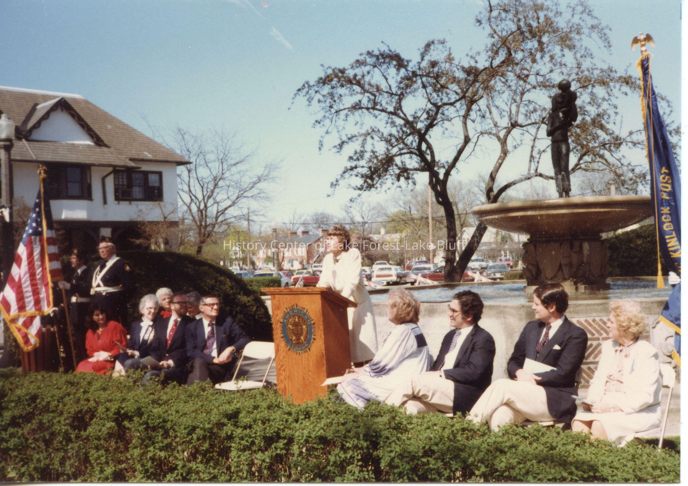 Color photographsof Daughters of the American Revolution dedication of bronze marker in Market Square May 12, 1984. Susan Dart at podium. Mayor Francis C. Farwell seated in second chair to left of podium. See Lake Forester, 5-10-1984.