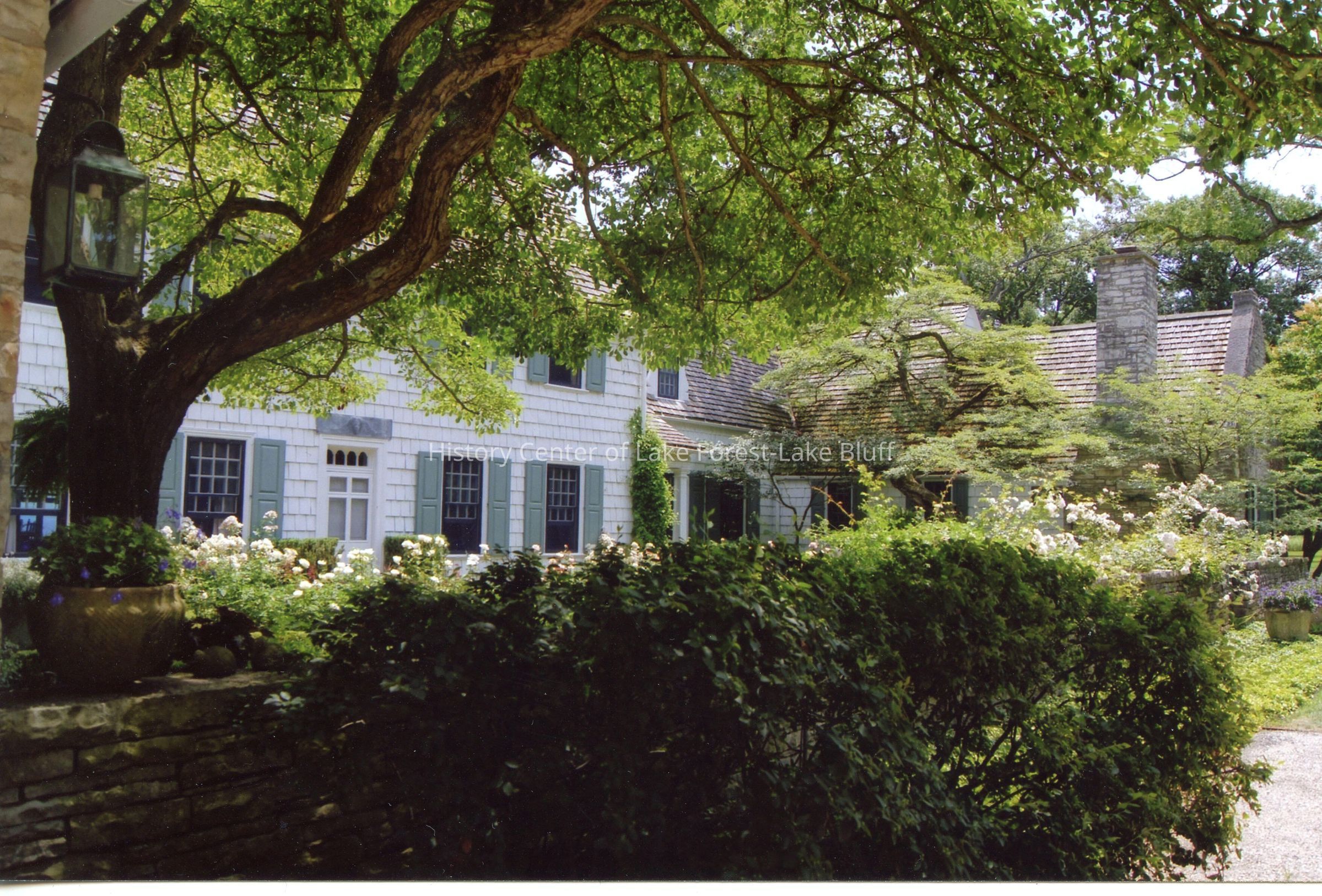Crab Tree Farm. Designed by David Adler. June 24, 2012. Rose garden and main house, west side. Color photograph.