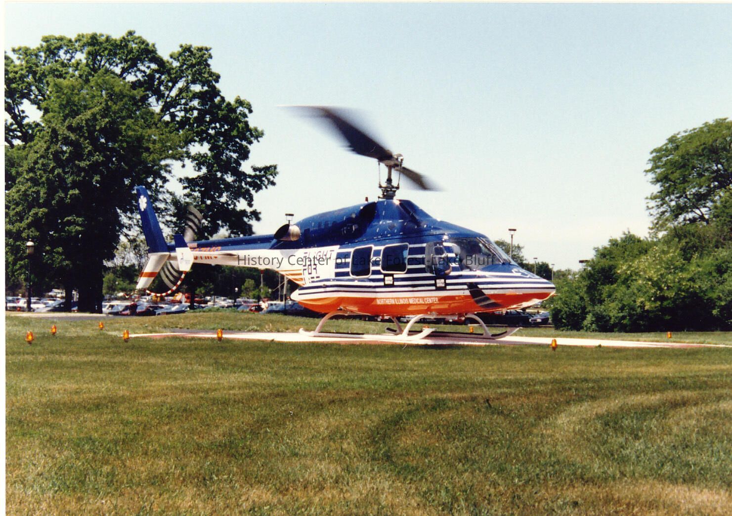 Flight for Life helicopter in front of building. Photographs relating to Lake Forest Hospital collected for the 100th Anniversary of the Hospital by the Development Department.