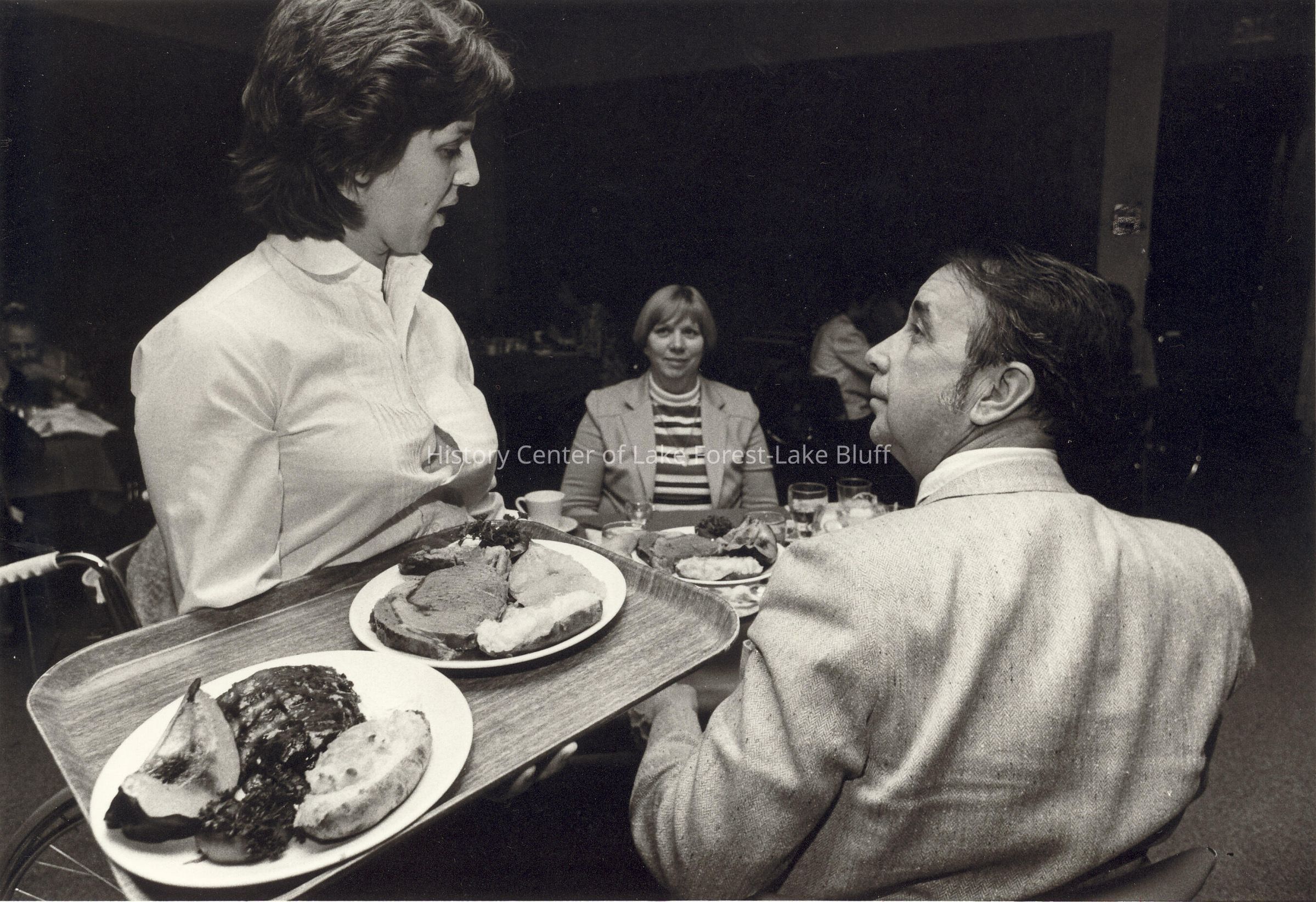 Mr. Bill lBuell with his wife Blanche, are visiting her mother, Blenda Nordlund. The woman in the foreground is holding a tray with two plates, each with prime rib and baked potato. Photographs relating to Lake Forest Hospital collected for the 100th Anniversary of the Hospital by the Development Department.