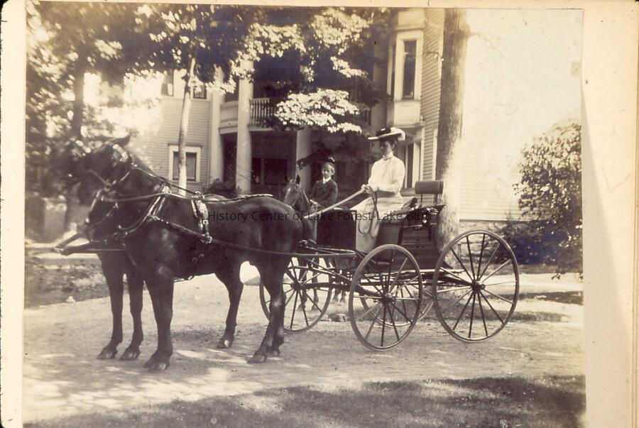 Grace Farwell Winston and Farwell Winston in a horse and buggy In front of family home at Lake Road and Mayflower, House In The Woods??